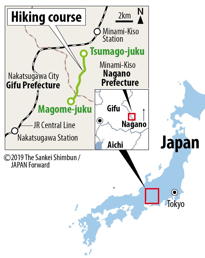 江戸時代の宿場町の面影を残す馬籠(まごめ)宿(岐阜県中津川市)をたち、石畳の坂を踏みしめ山に入った。熊よけの鐘を鳴らしつつ林道を縫い、ひなびた長屋やこぢんまりとした田んぼを横目に集落を通り抜ける。県境の峠を越え山間の茶屋で一服して、妻籠(つまご)宿(長野県南木曽(なぎそ)町)に下りてきた。約9キロ、3時間ほどのハイキングコースだ。道すがら、多くの外国人とすれ違った。