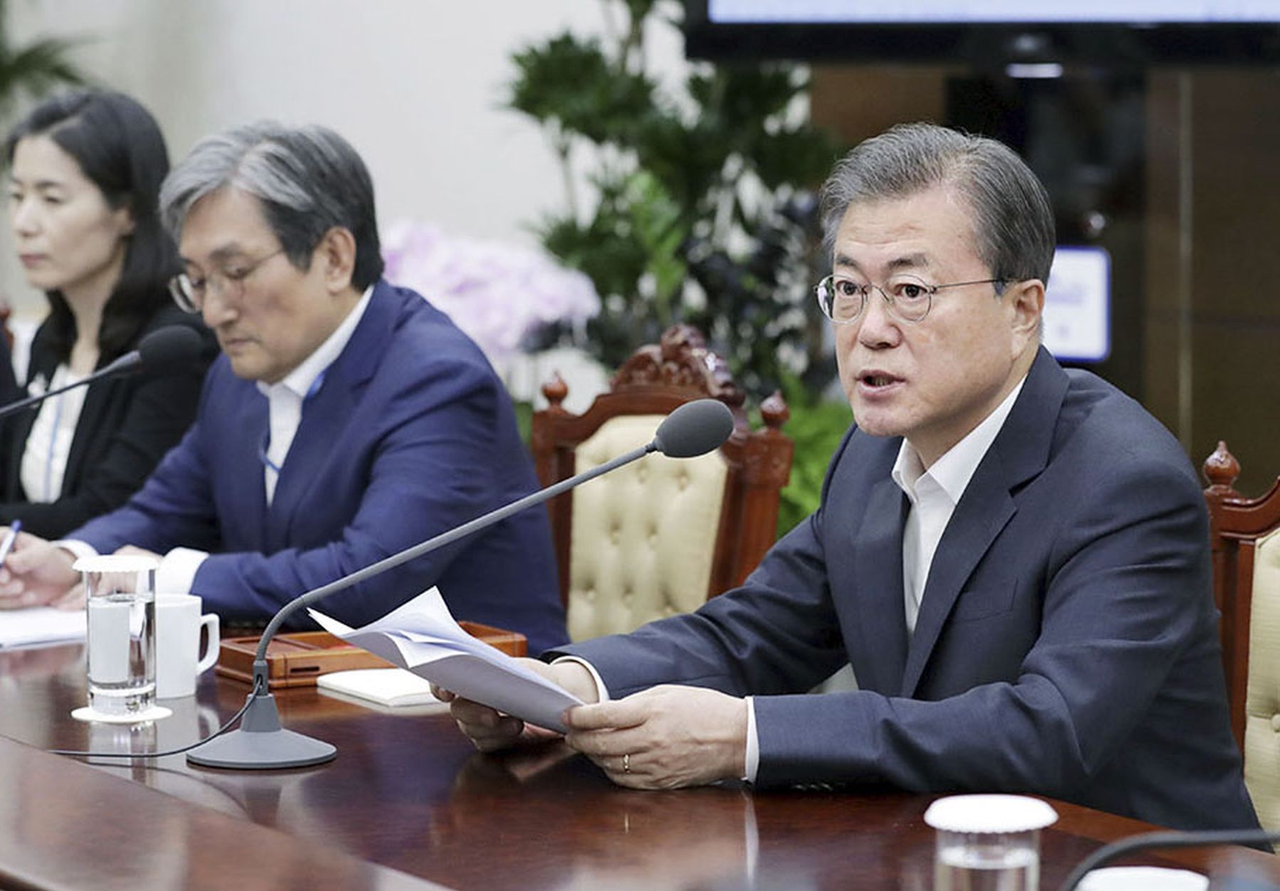 South Korean President Moon Jae-In is welcomed by Japanese Prime Minister Shinzo Abe upon his arrival for a welcome and family photo session at G20 leaders summit in Osaka, Japan, June 28, 2019. REUTERS/Kim Kyung-Hoon/Pool