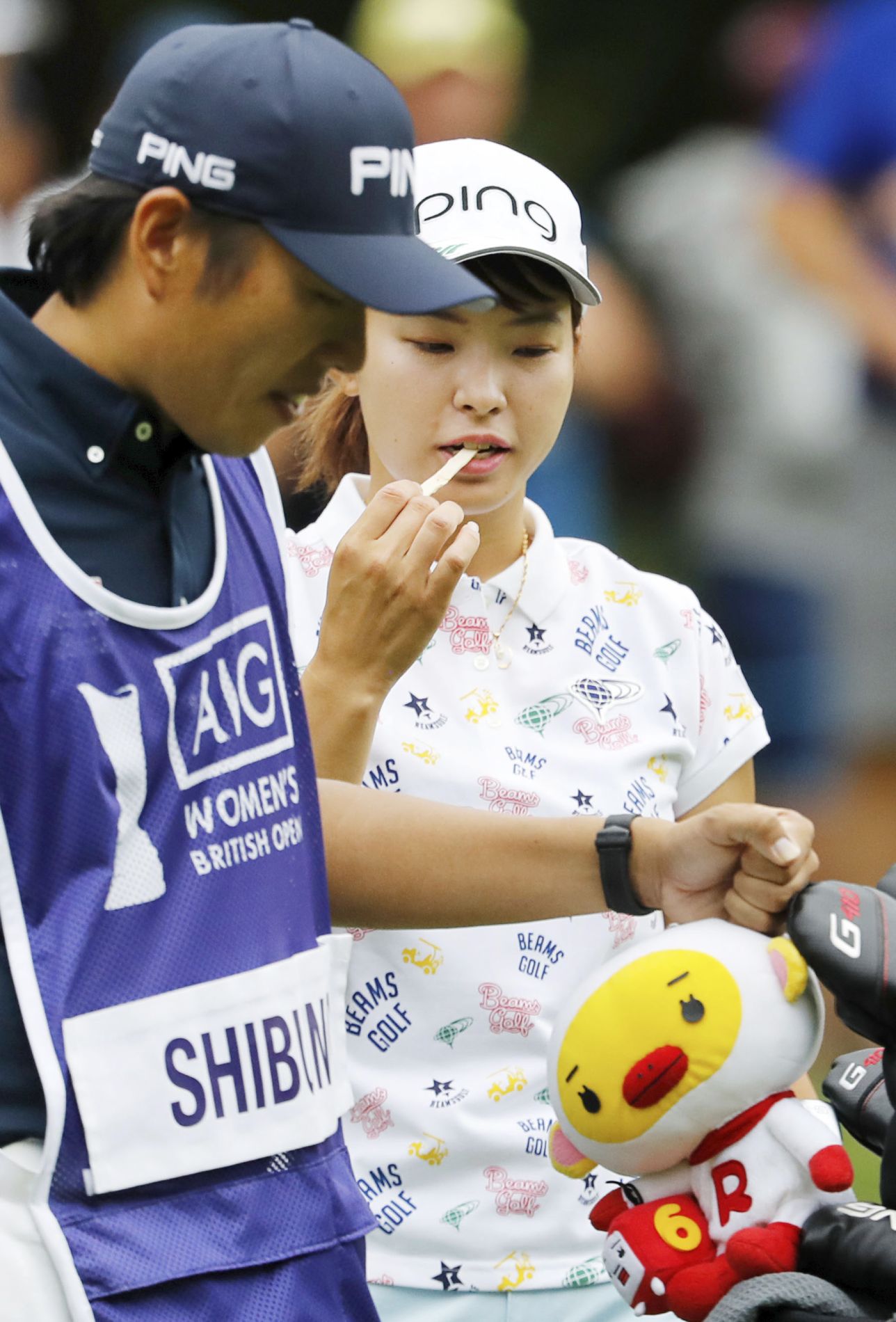 平昌五輪では、LS北見のメンバーが休憩時間にいちごをつまむ「もぐもぐタイム」が話題となった。渋野選手がプレーの合間にムシャムシャと口にしていたのは、おにぎりや大好物の駄菓子である。