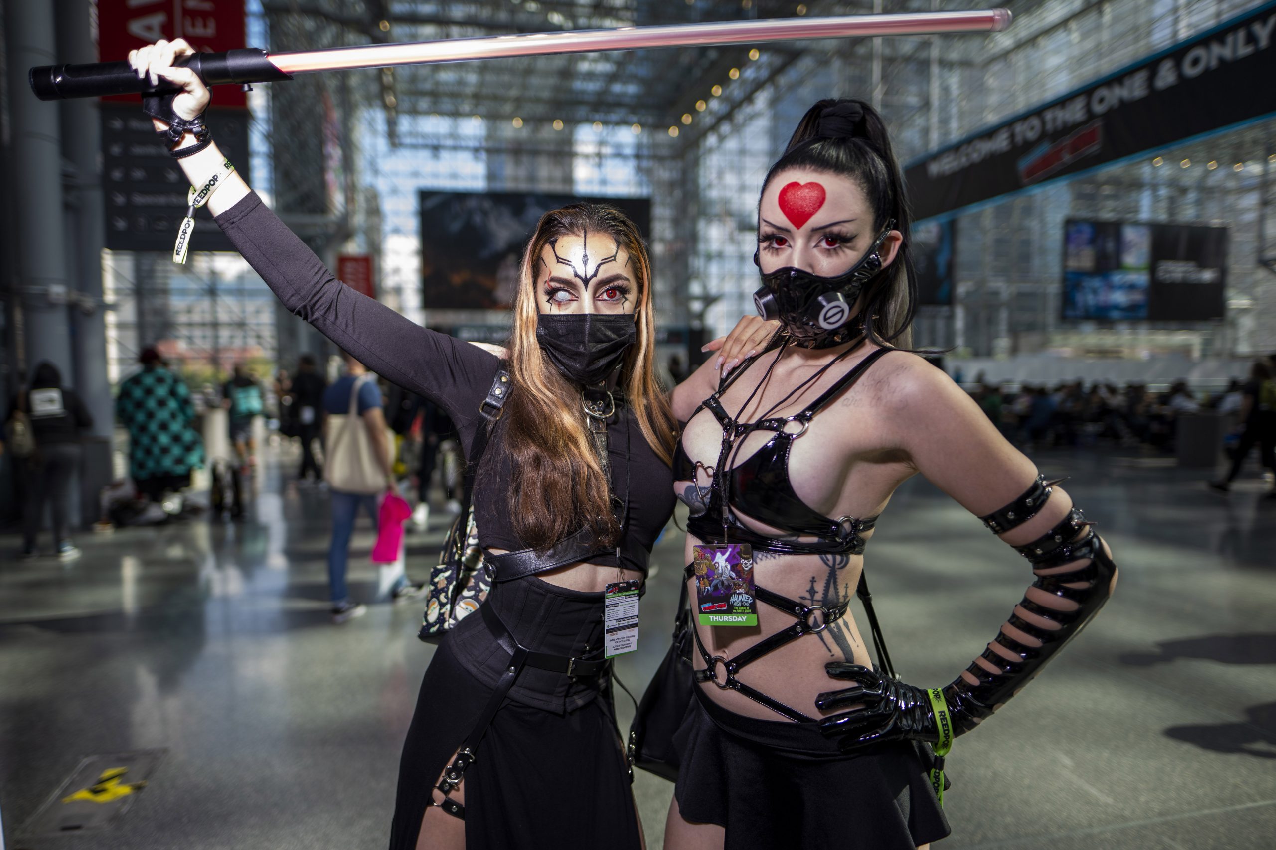 会場のジェイコブ・ジャビッツ・コンベンションセンターでポーズをとるコスプレイヤー =7日、ニューヨーク