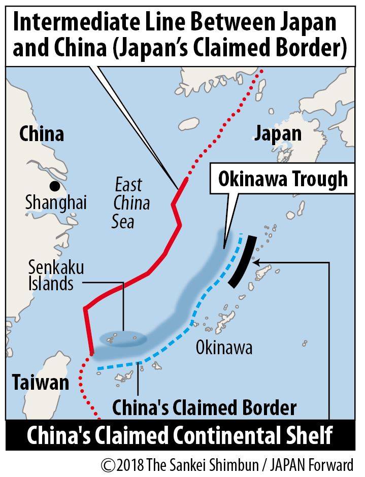 Under the banner of “Building a strong maritime nation,” China is proposing to extend its own continental shelf 150 nautical miles, or 278 kilometers, past the geographical Japan-China Median Line, all the way to the Okinawa Trough. Their objective is considered to be the expanded development of natural resources in the area.