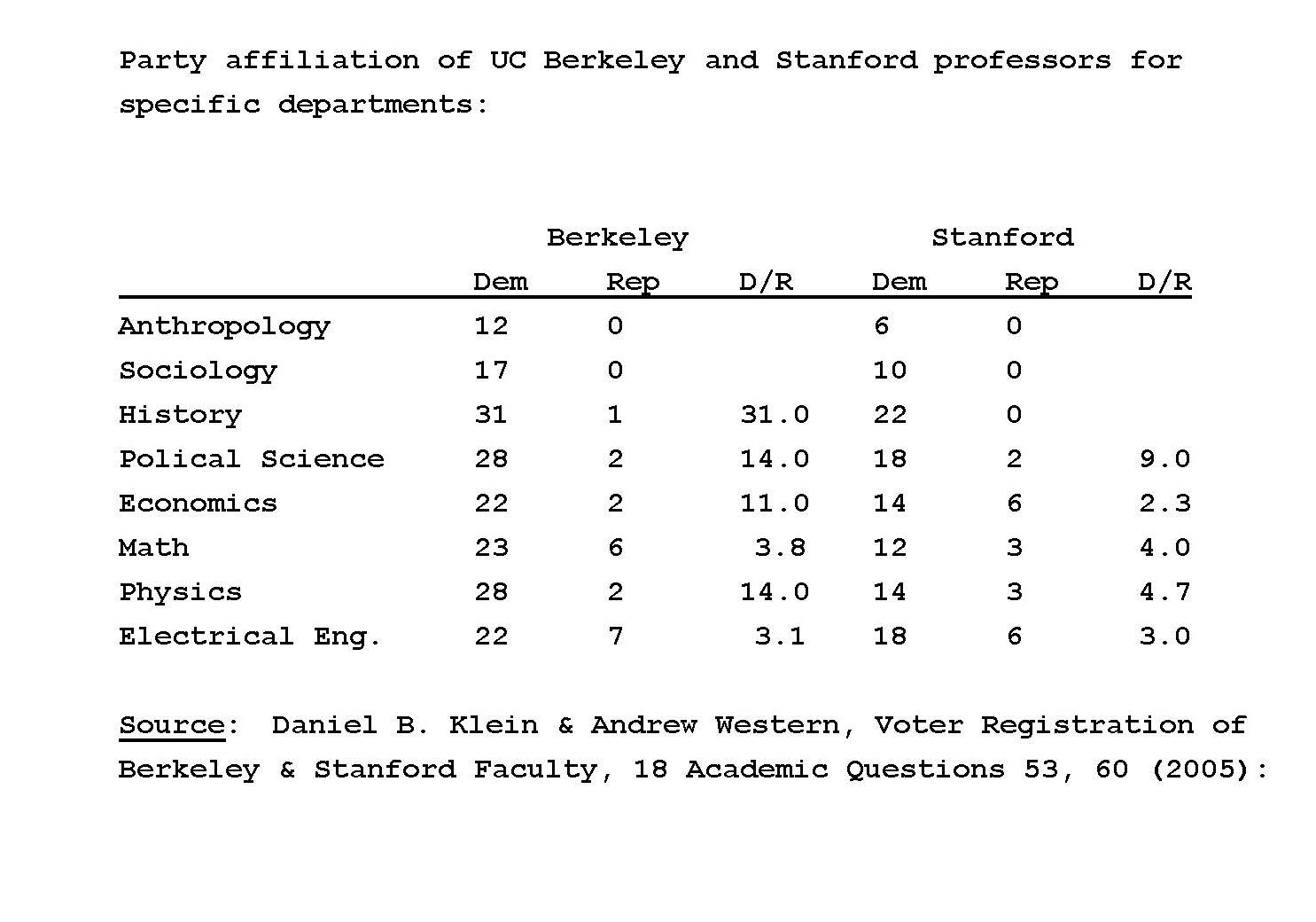 Similarly, in 2005 two professors published a study in which they used voter registration records to explore the party affiliation of UC Berkeley and Stanford professors. Consider several of the more important departments:
