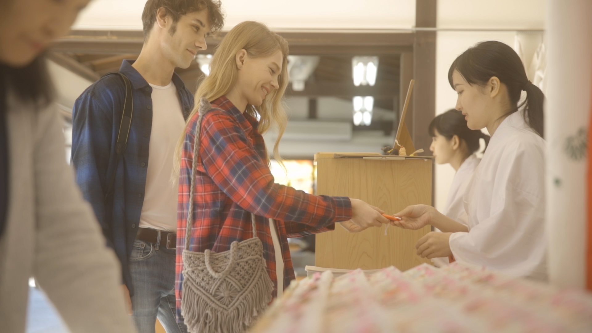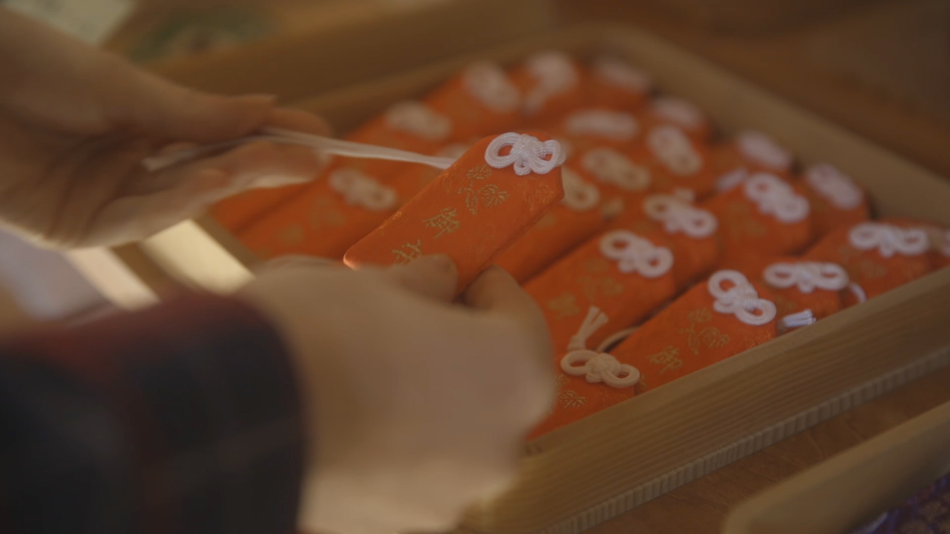 The video gives the example of woman visiting a shrine who has just lost her ring. She is happy that, after buying the omamori, she has finally found it!
