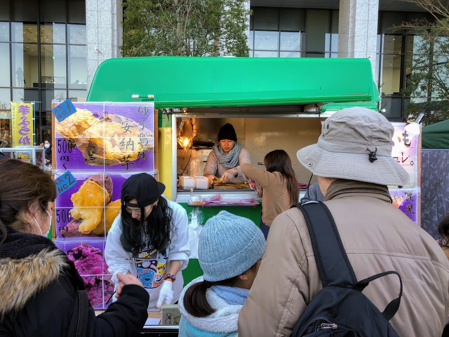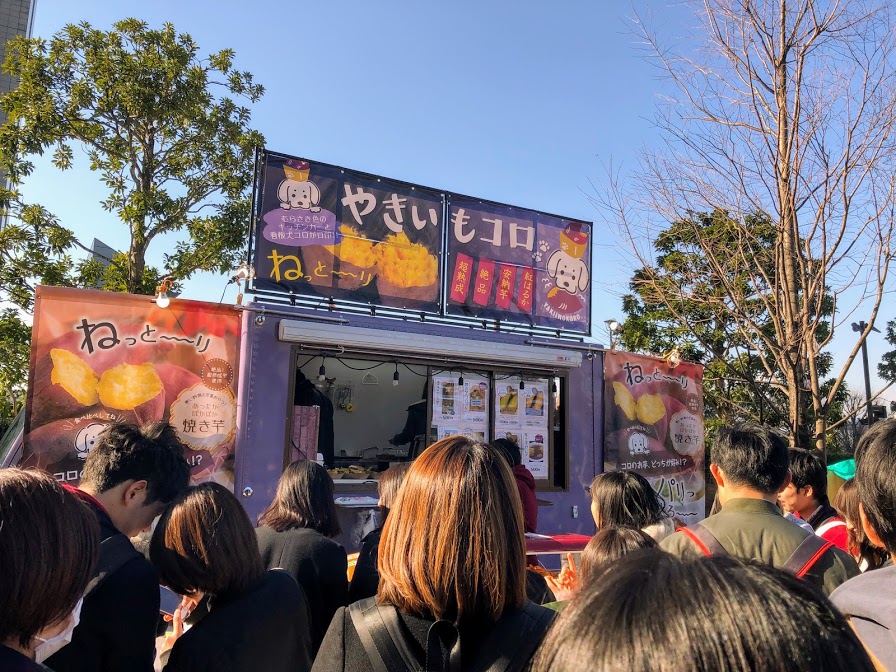 The venue of this festival was Shinagawa, close to JR and Keikyu Railway Shinagawa stations. This, to me, was unexpected. Shinagawa is more identifiable as an office building district rather than an entertainment-filled area with bizarre food events. However, the event turned into a sweet potato paradise hidden between Shinagawa’s skyscrapers. There was even a lawn in the middle of the plaza with adorable sweet potato-themed kotatsu (cozy heated tables).