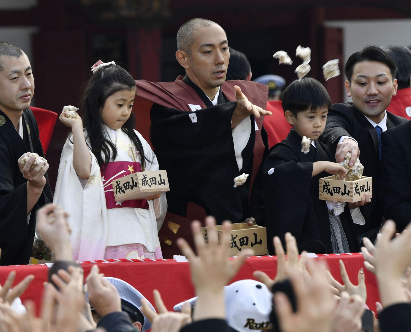 This year’s guests of honor were an all-star cast led by Ichikawa Ebizo, a kabuki theater superstar. Joining him at the well-known temple were his five-year-old son Ichikawa Shinnosuke, sumo top Yokozuna wrestler Hakuho, and younger Komusubi rank sumo wrestler Mitakeumi. NHK TV drama actor Sadao Abe also joined in the extravaganza.