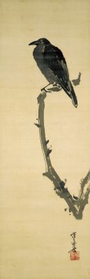 Kawanabe won renown for his giga (comic) pictures, satiric illustrations and yokai (ghosts and goblins) paintings, and many fascinating examples of these various genres are on display. However, the viewer can readily see in his painting Winter Crow on a Withered Branch (Koboku kanazu) his roots as an artist trained in the traditional Kano School style. This painting became the talk of Japan at the time it won the grand prize for the painting category at an exposition in Japan in 1881 and the owner of the Eitaro confectionery store offered to buy it for an outlandishly lofty price.