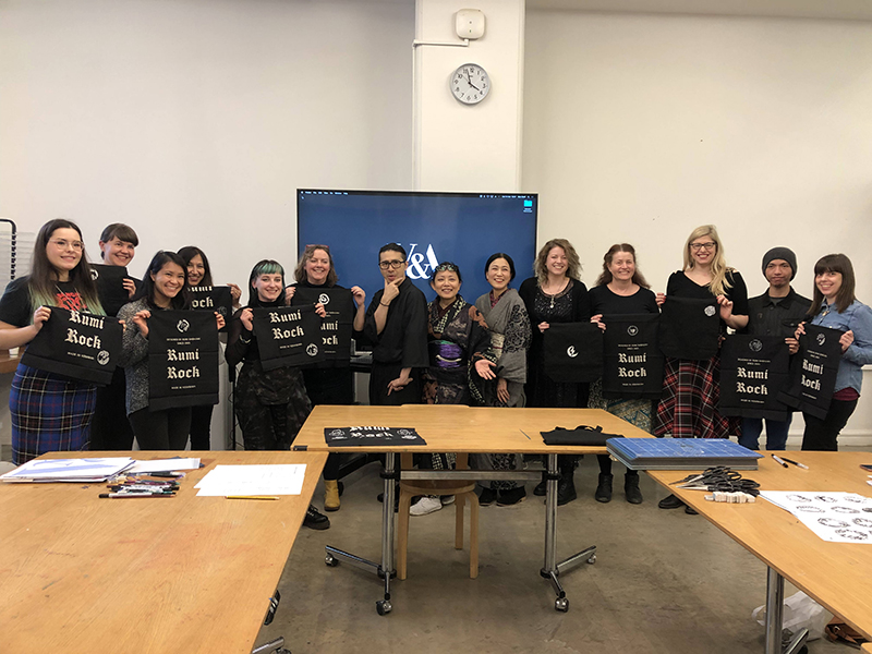 The final event was by Rumi Shibasaki and Kaneko Kazuaki at the Victoria and Albert Museum. It was a sellout workshop where the participants learned about the meaning of family crests, or kamon. Then they designed their own, stencil cut them, and finally dyed them on bags and hand towels from Rumi Rock. The variety of designs that were produced was really amazing, and everyone had a great time at the workshop.