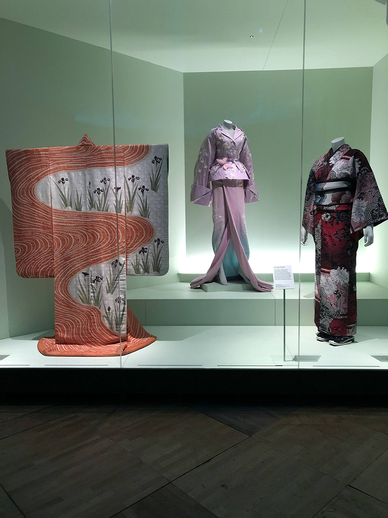 In the third section, the kimono of living national treasures, such as Moriguchi Kunihiko and Shimura Fukumi, are shown alongside the work of contemporary fashion brands, such as Rumi Rock, Iroca, Jotaro Saitoh, Yoshiki Kimono and Modern Antenna. Fashion inspired by the kimono, such as works by Galliano for Dior, Yohji Yamamoto, and Issey Miyake, were also there.