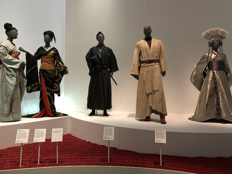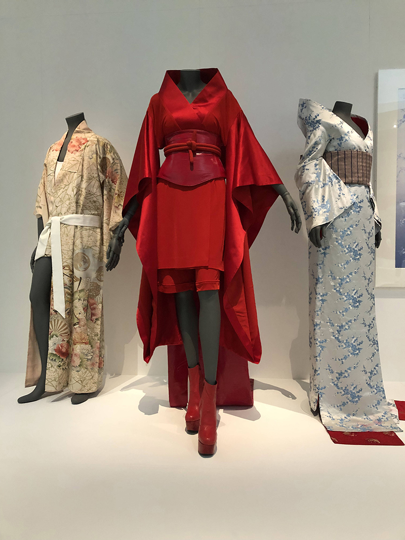 The costumes for Kurosawa samurai films, Memoirs of A Geisha and Star Wars, stood next to a large video screen with Lady Snowblood, visual kei bands in kimono, and actor Toshiro Mifune in samurai style. There were photographs of Bjork and Bowie in their kimono-inspired wear, as well as garments worn by Madonna and Freddie Mercury.