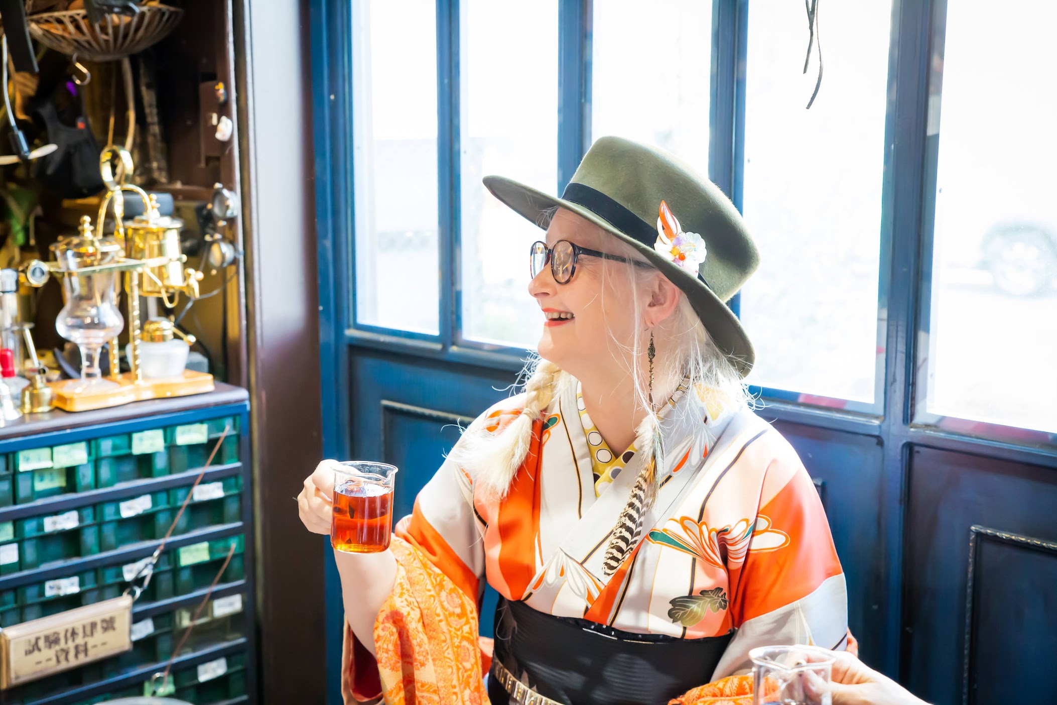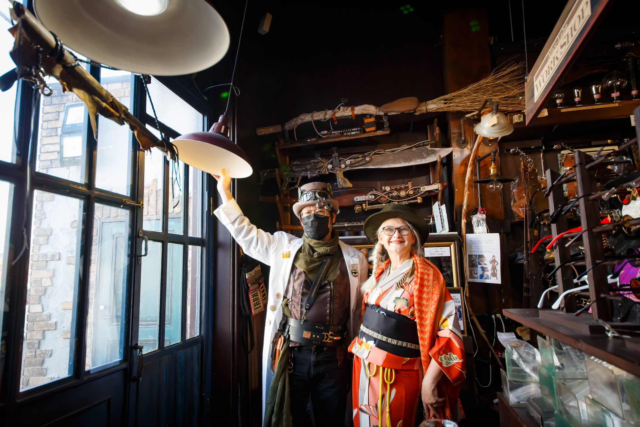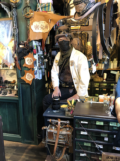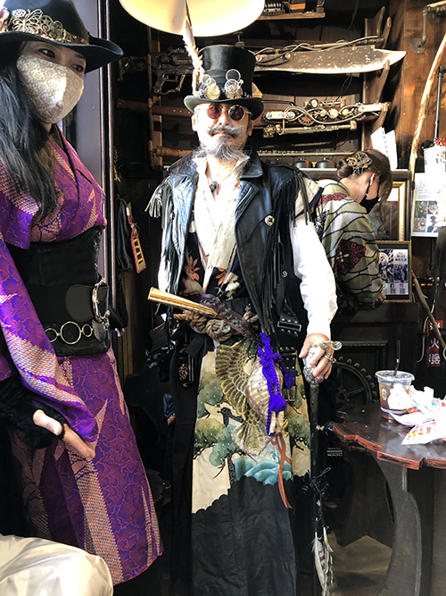 Here I was introduced to Mac’s wasou steampunk friends. They gather at Alice Blanche almost every day. Another gentleman who cuts a stylish figure is Shyutaro Hasaygawa Joseph, who looks as if he came out of a Japanese version of Pirates of the Caribbean. Over his buckle boots and gaucho pants he has a black women’s kimono belted on, and a piece of armour hanging on the other side. He wears a white shirt, waistcoat and carries a cane, and has a top hat with a long feather, dark sunglasses and generous whiskers to finish off the look. He has a particular interest in time pieces.