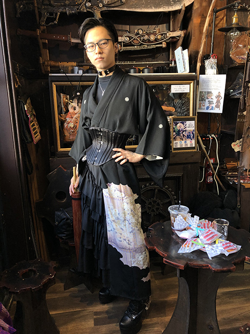 Mac’s friends were all wearing a kimono or haori, but not in the conventional way. They were tucked up short and worn with boots or crazily high heels and fishnet stockings. They were worn under black lace skirts and with corsets and haori. They were worn in layers and belted on.