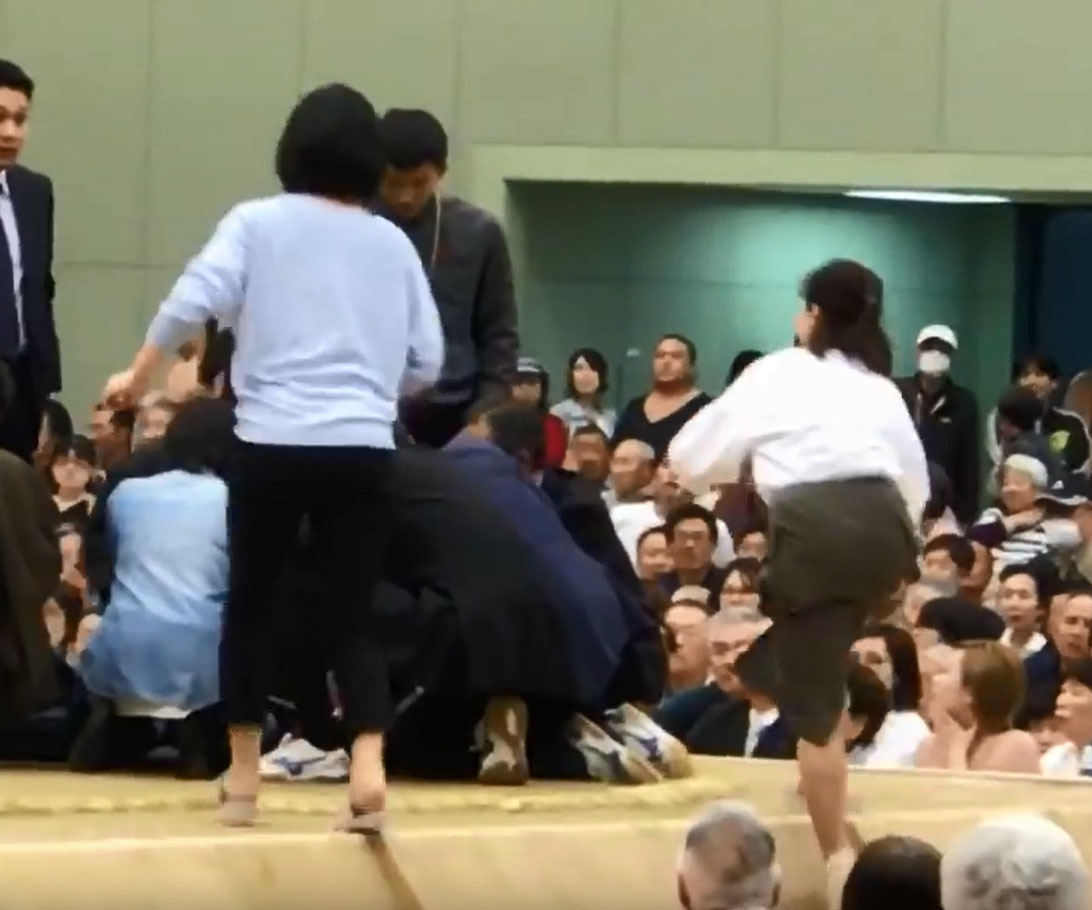The women were immediately ordered to leave the ring over the public address system because the ancient sport traditionally barred women from stepping inside the dohyo.
