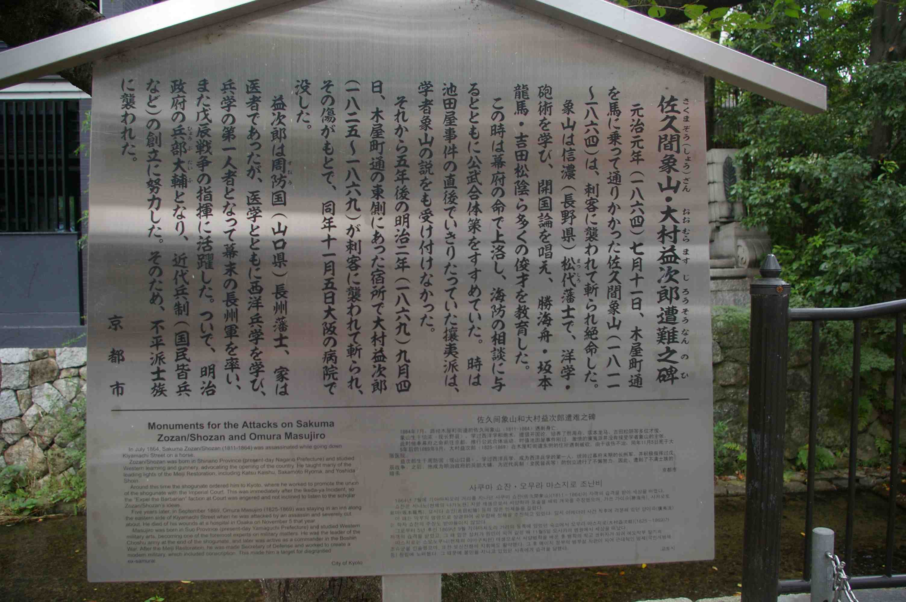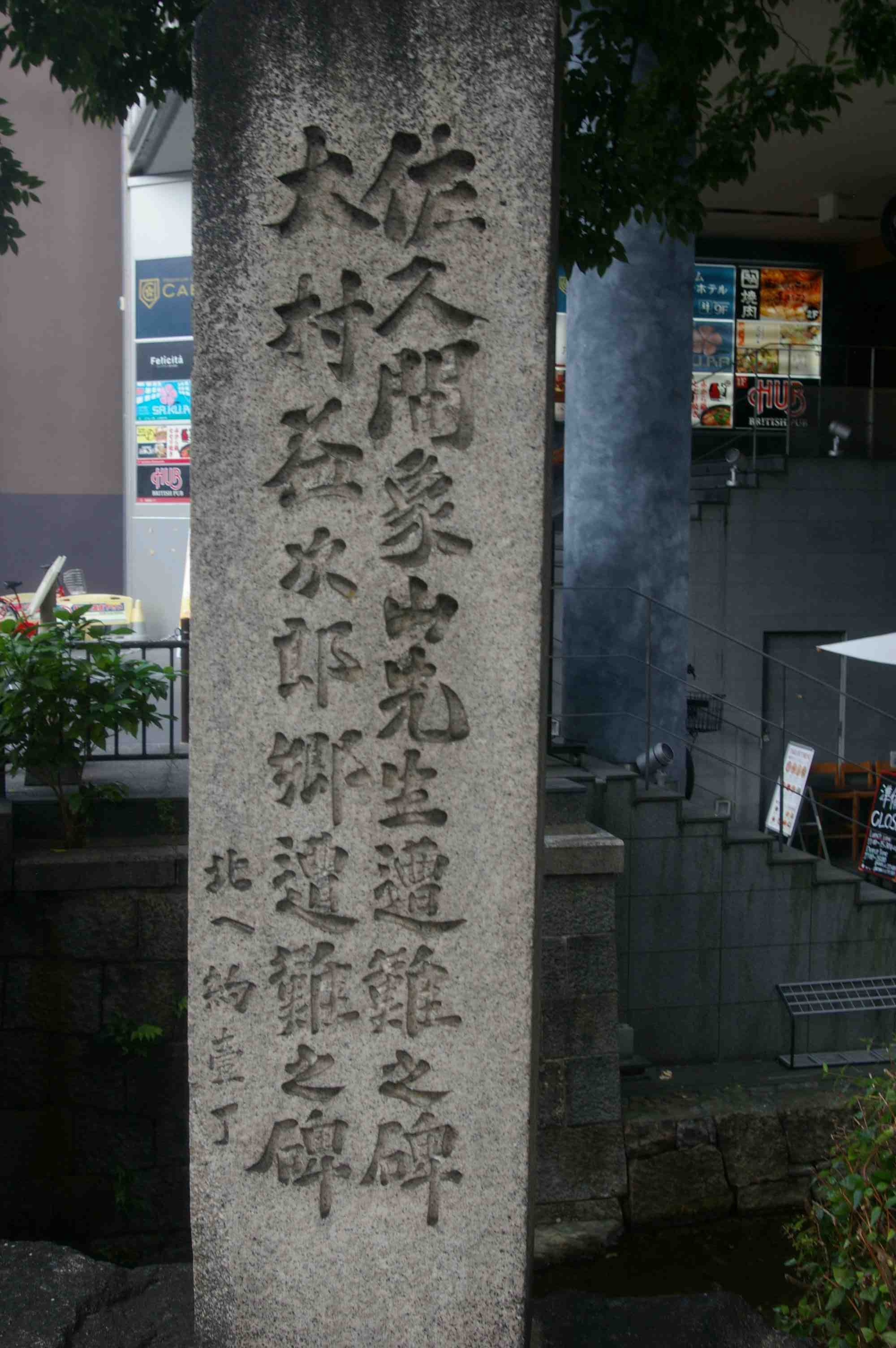 At the northeast corner of the small bridge where Sanjo crosses the Takase stands a stone pillar and plaque commemorating the fact that, very close to this spot, two of the most interesting players in the restoration drama fell to the swords of assassins. The amazing part is that the attacks occurred five years apart.