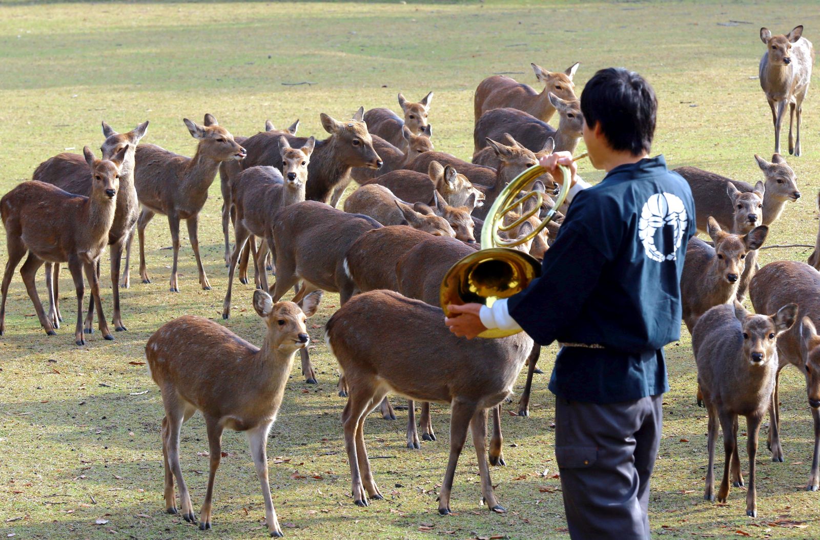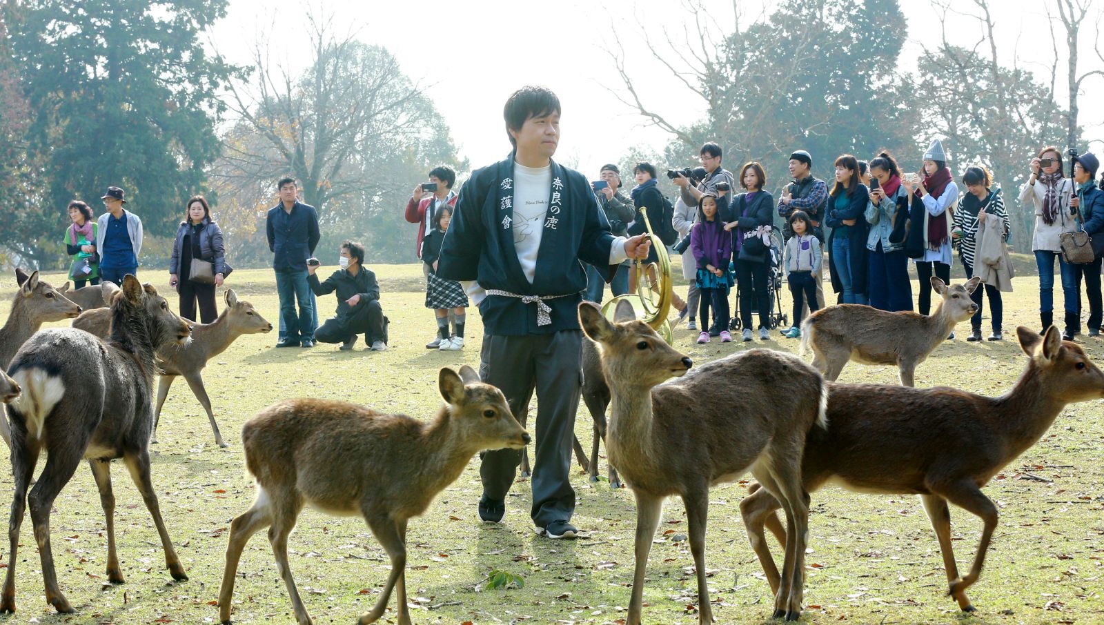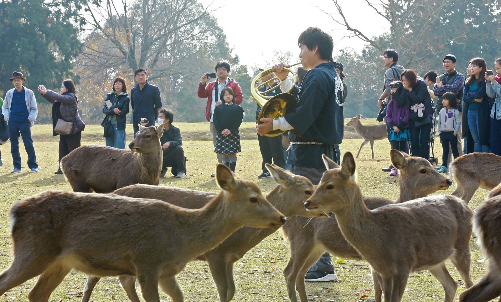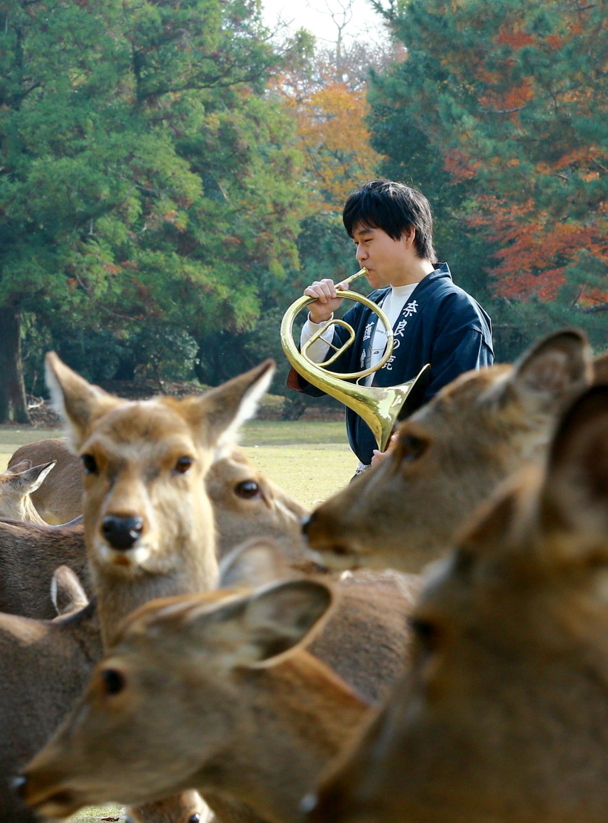 The man playing music is part of a local deer protection association, the Nara Deer Aigokai. As the deer gather around him, he feeds them acorns, which the animals nibble happily.