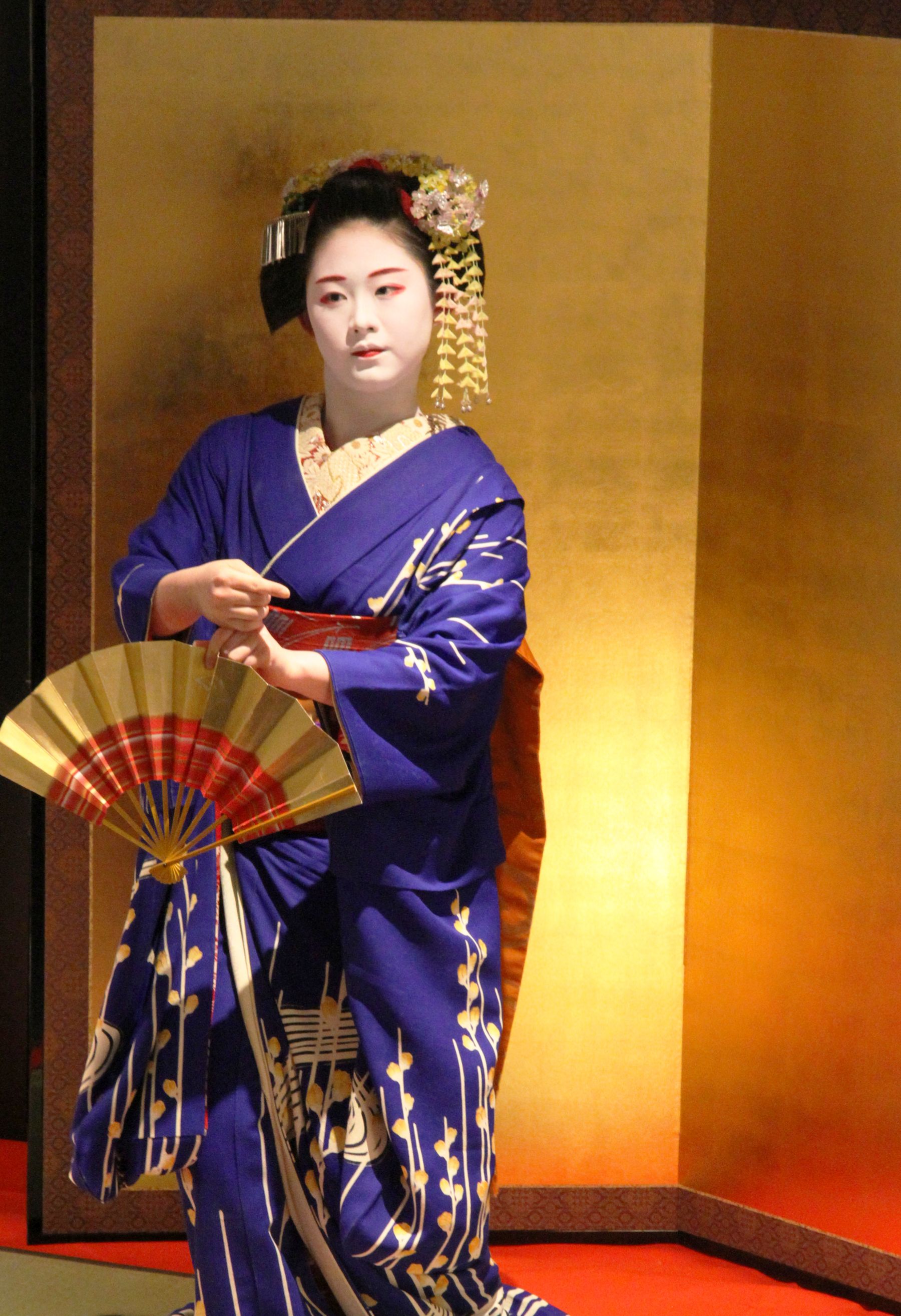 Every month around the third week of the month (details vary so please double check) Intergate Kyoto in Shijo-Shinmachi gives tourists/guests a chance to watch maiko perform dances wearing costumes made of products from traditional industries.
