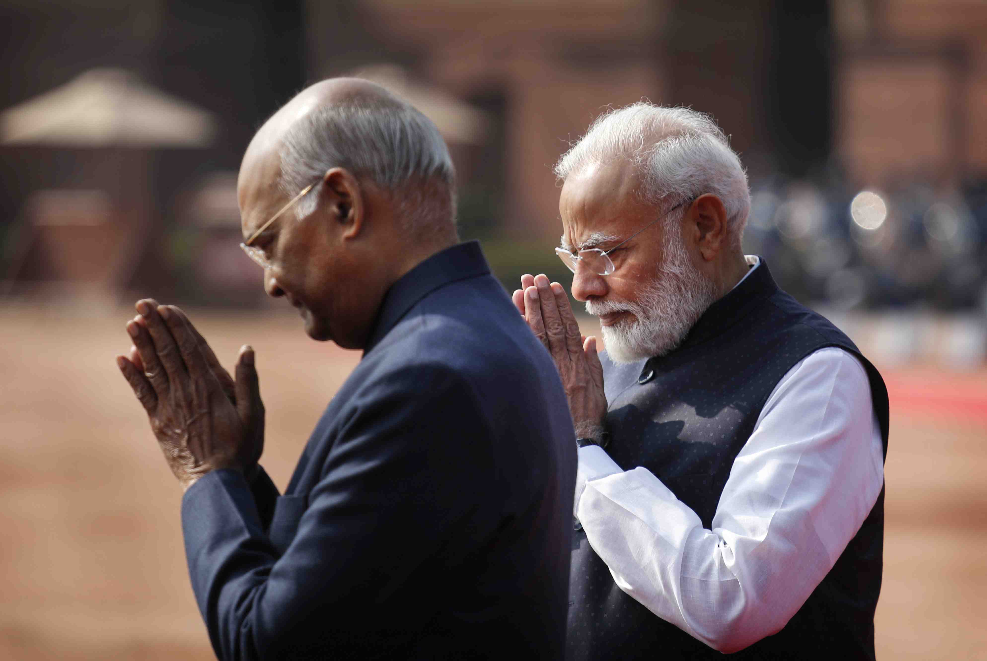 Indian Prime Minister Narendra Modi, right, stretches his hand out towards Sri Lankan President Gotabaya Rajapaksa, as Indian President Ram Nath Kovind stands beside them, during a ceremonial reception for Rajapaksa at the Presidential Palace in New Delhi, India, Friday, Nov. 29, 2019. Rajapaksa is on a three-day official visit to the country. (AP Photo/Manish Swarup)