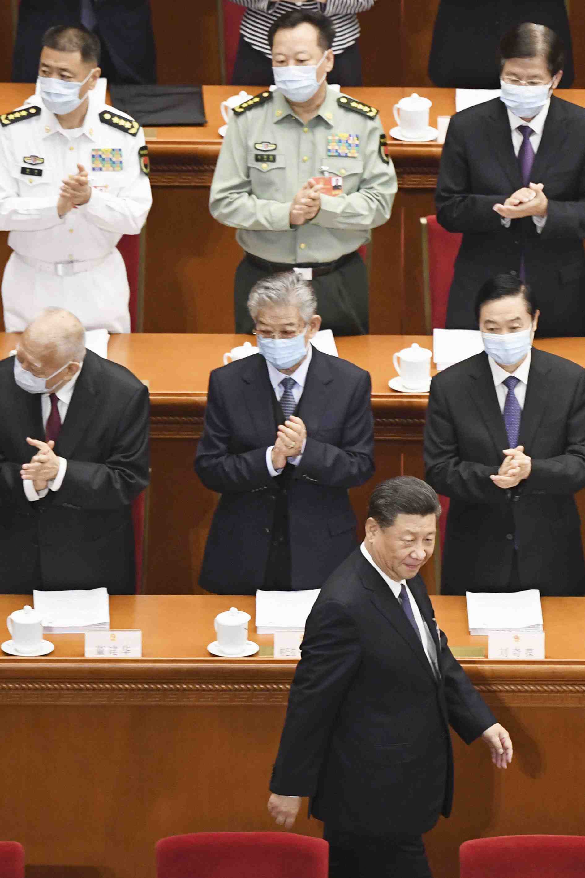 Chinese People's Liberation Army (PLA) soldiers wearing face masks to protect against the spread of the new coronavirus march past a banner depicting Chinese President Xi Jinping at their living squatter inside the Tiananmen Gate in Beijing during a plenary session of China's National People's Congress (NPC) at the Great Hall of the People in Beijing, Monday, May 25, 2020. (AP Photo/Andy Wong)