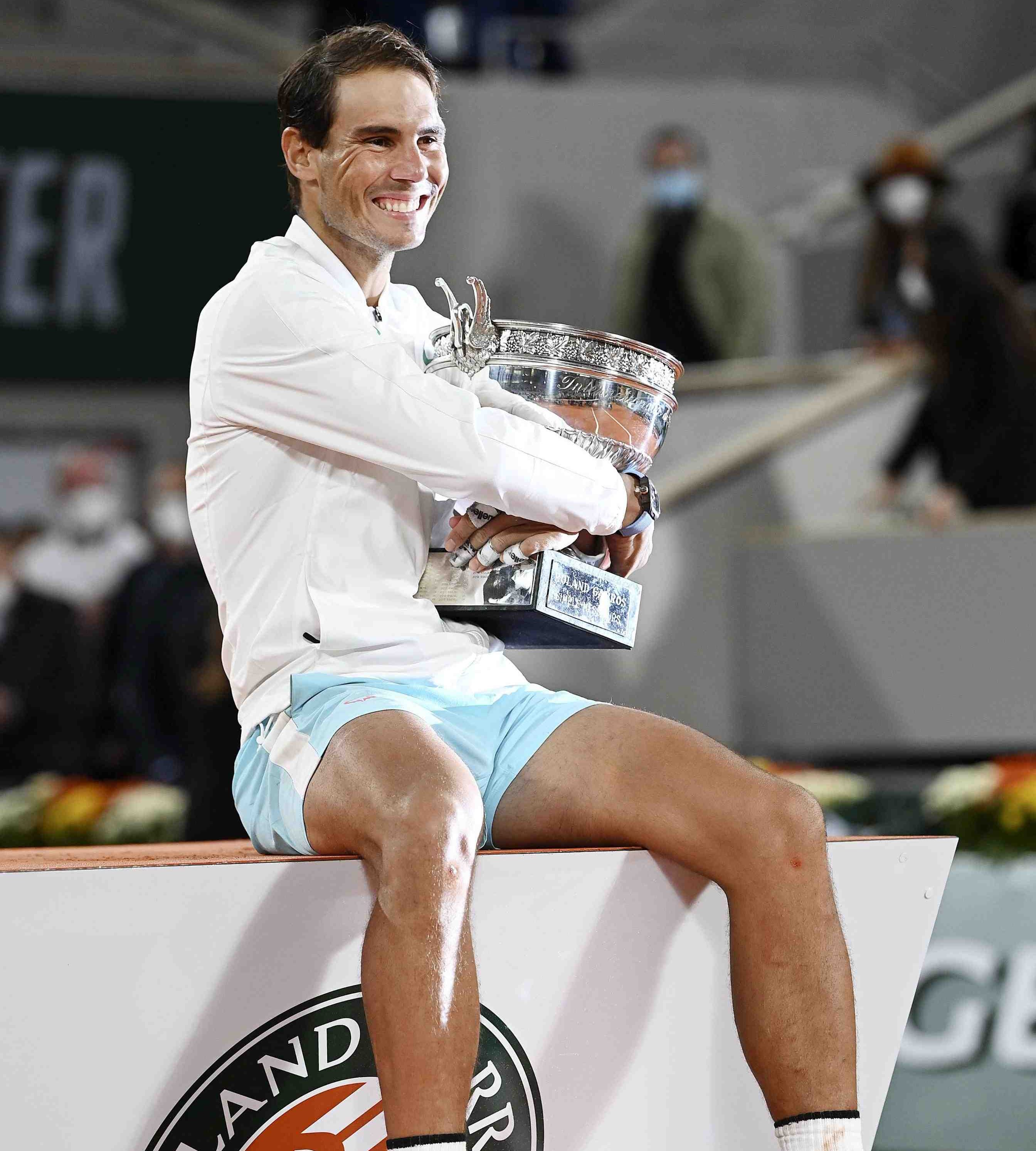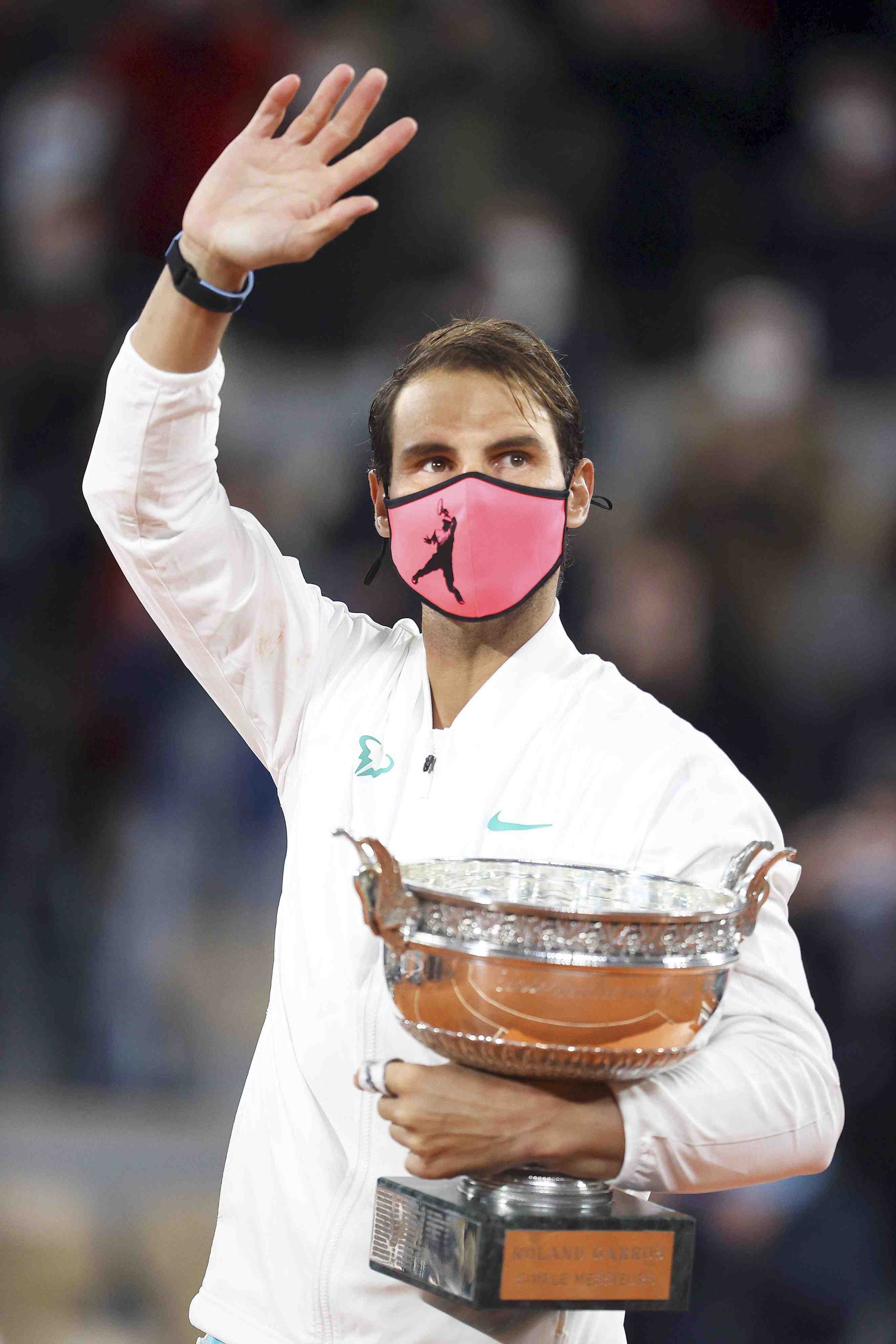 A familiar sight: Rafael Nadal holding the winner's trophy at the end of the French Open.