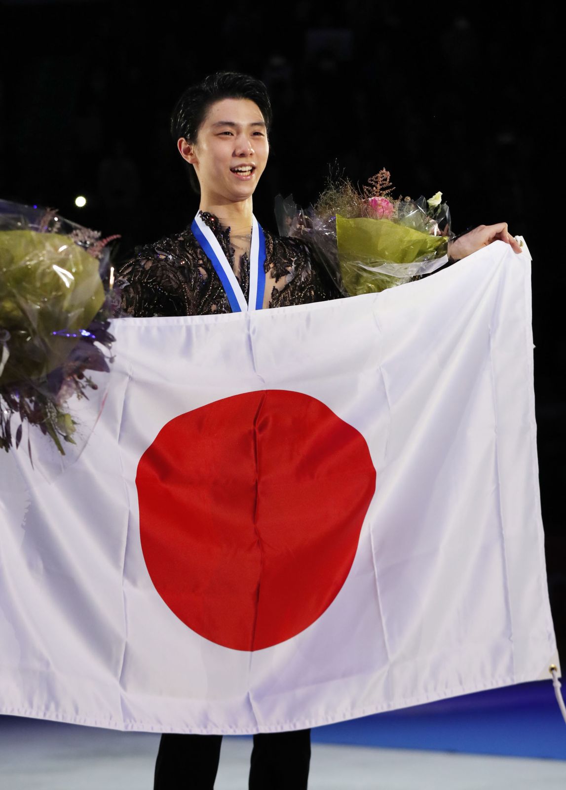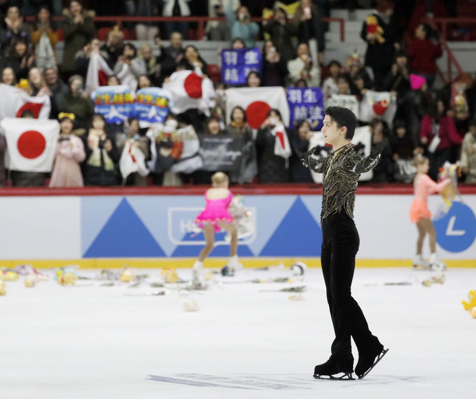 Fans showered the ice rink with Winnie the Pooh stuffed toys after Hanyu scored 106.69 points scored in the short program on Saturday, followed by 190.43 in the free program. Both scores were the highest of the season so far.