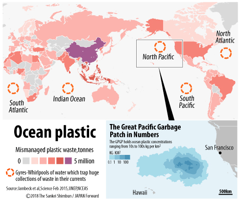 The problem is not limited to a remote part of the Pacific Ocean, however. The Japanese government disposes of almost 100,000 metric tons of seaside trash annually. Much of this originates from China, which, alongside Indonesia, is generally considered one of the largest producers of mismanaged plastic waste, generating about 8.82 million metric tons in 2010. Trash can be found on the coastlines of Kyushu and Honshu, while nearly 80% of seaside debris found in Okinawa Prefecture is believed to have originated from China.