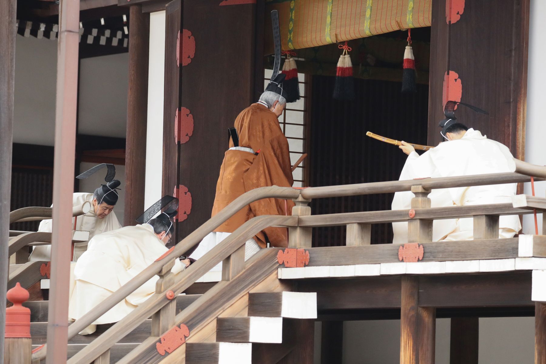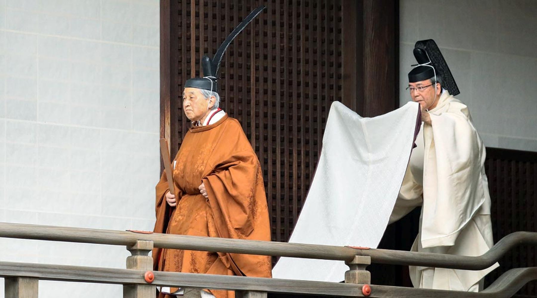 In a morning ceremony that lasted about 10 minutes, the 85-year old Emperor of Japan reported to a special sanctuary in the Imperial Palace called the Kashidokoro to officially announce the end of his reign to the kami. This is a ceremony which is said to have existed from the Heian era (794-1185).