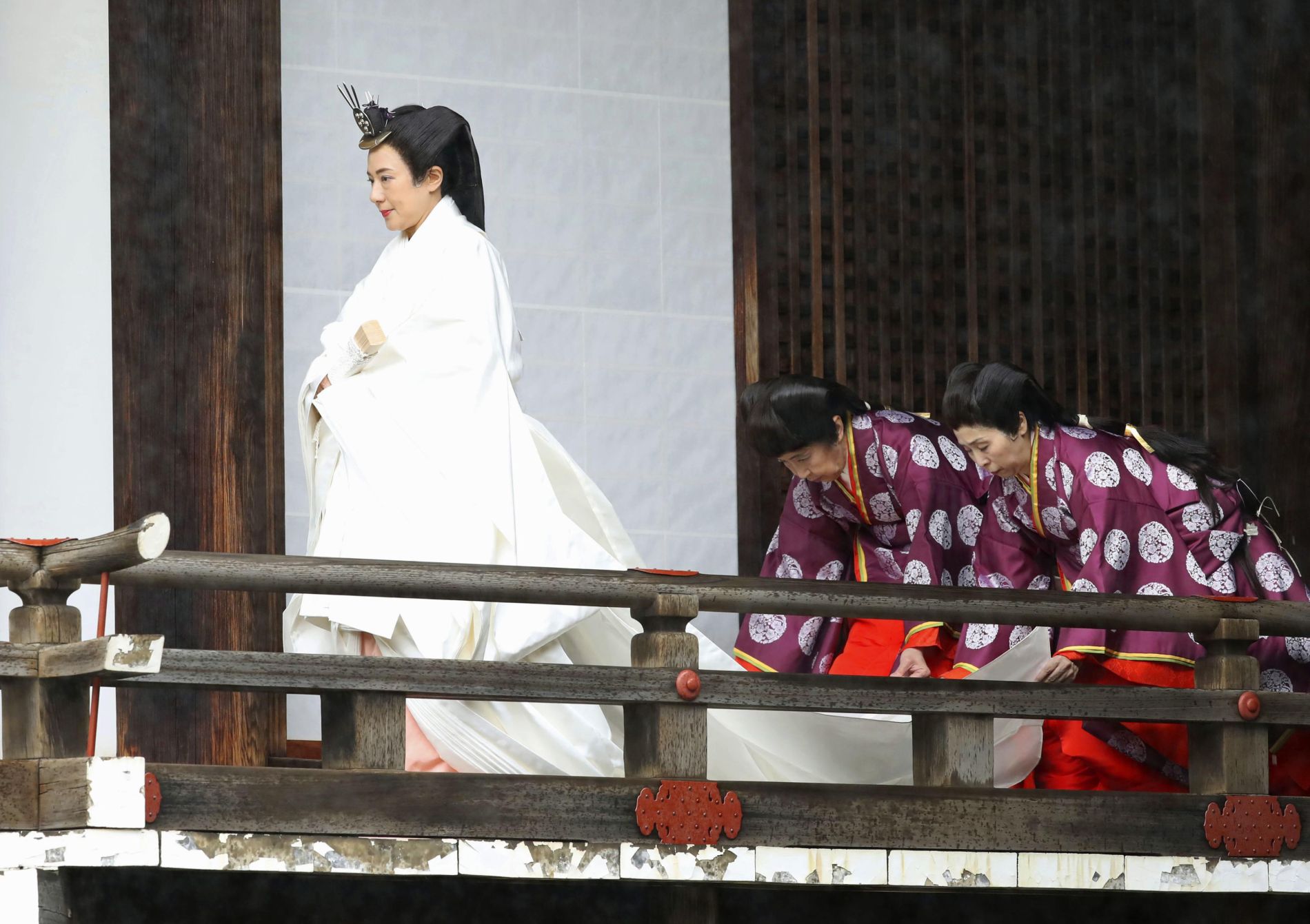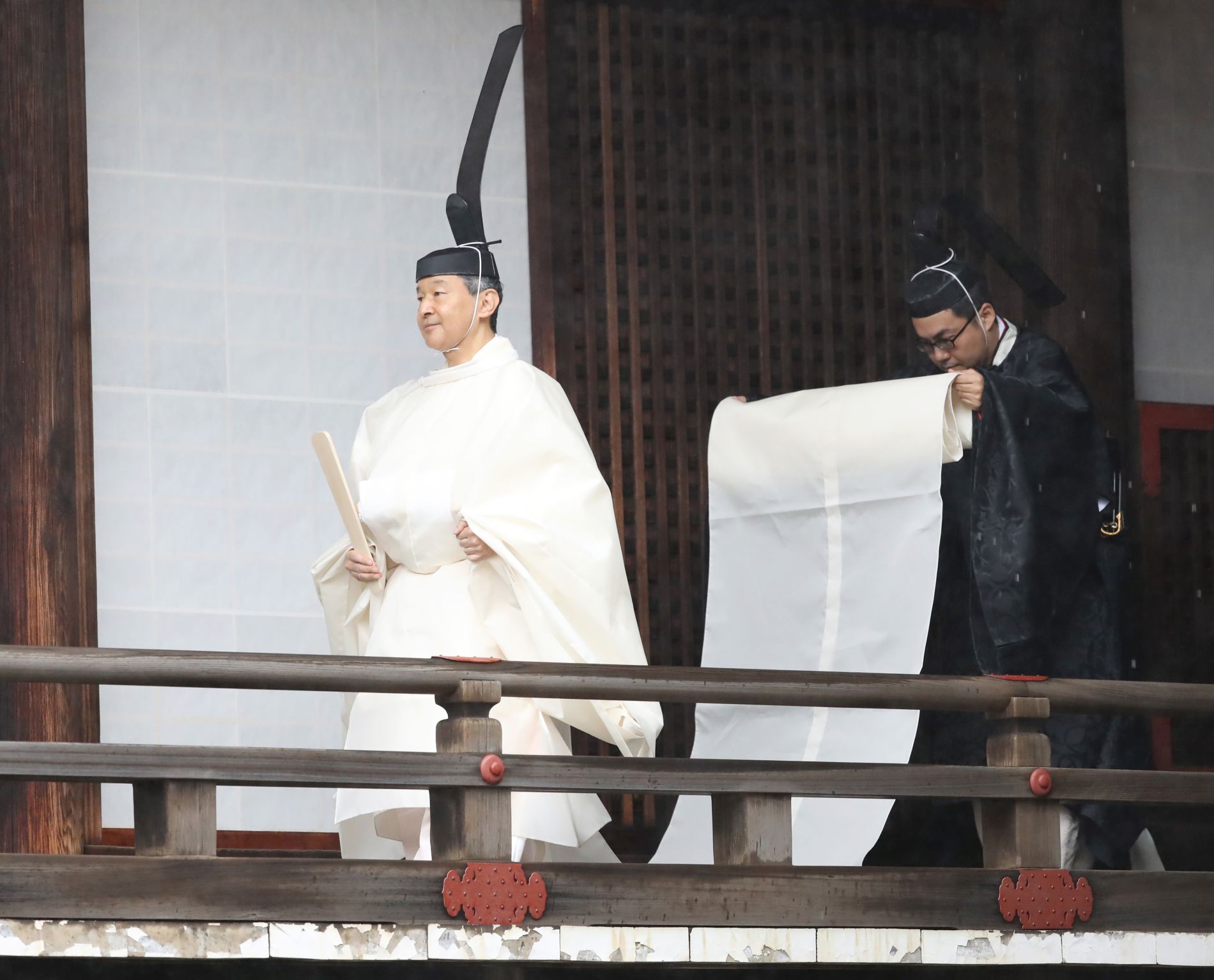 On the morning of Tuesday, at about 9 A.M., Naruhito was already engaged in preparatory rituals to announce the impending enthronement ceremony to the deity Amaterasu. Wearing a pure white kimonos, Emperor Naruhito and his wife Masako, were seen at the Three Palace Sanctuaries within the imperial grounds, and then heading to the Kashidokoro.