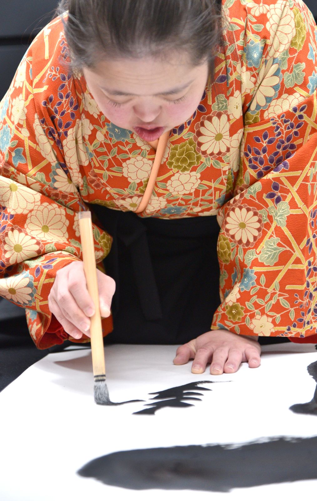 And it was with her mother’s help that Shoko completed the demanding task. It takes a lot of work to make the writing in the mind visible for all to see. Ink has to be poured into buckets and then sopped up with stray sheets of paper when it spills. A giant black felt carpet has to be rolled out as a place for the calligraphy writing to take place. Brushes must be cleaned and dried, and Shoko’s flowing kimono must be pinned back and held up so that it doesn’t dip into the fresh, glistening brushwork below her as she moves back and forth across the vast paper square.
