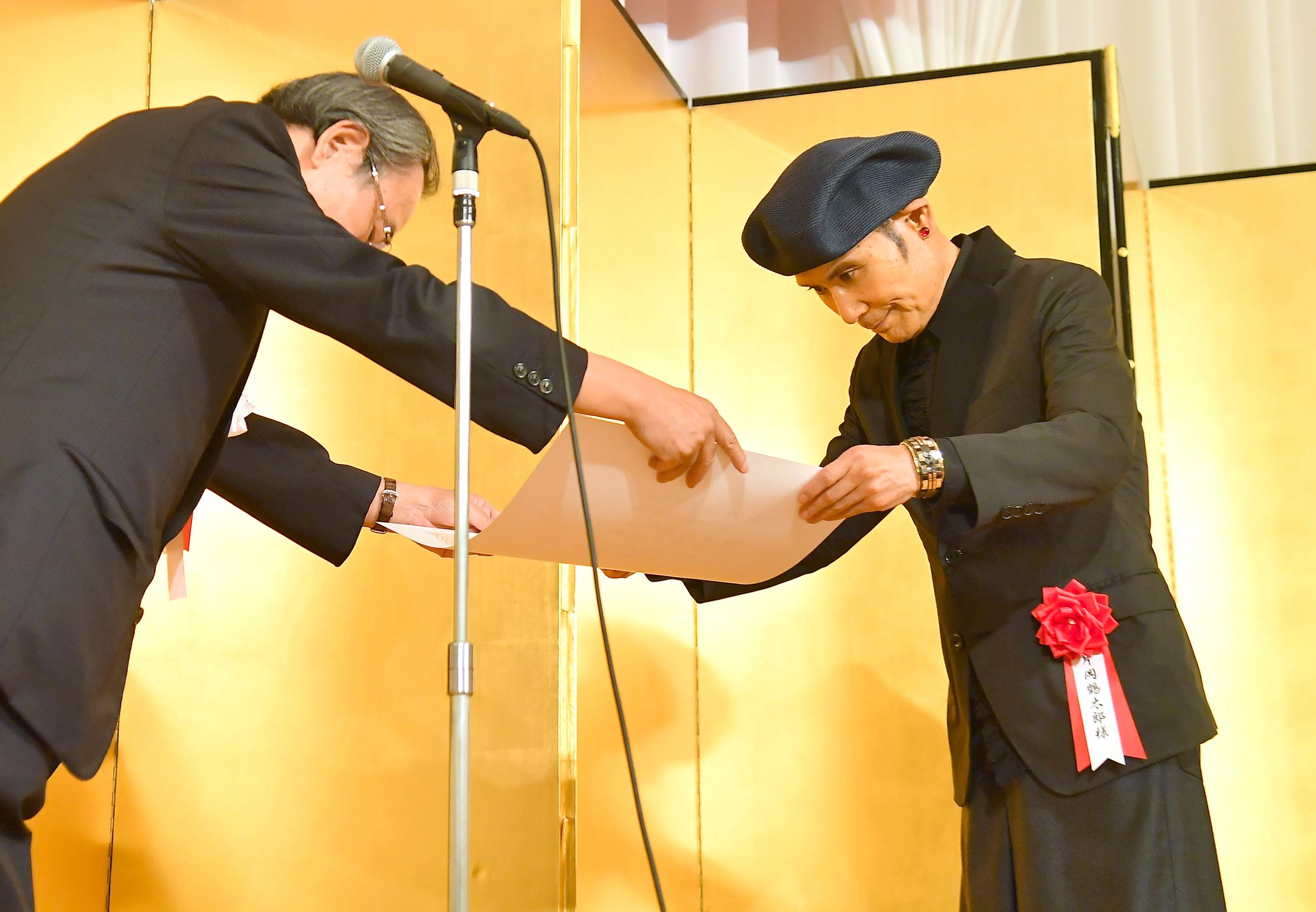 The Distinguished Service Award was conferred upon actor and painter Tsurutaro Kataoka, who has regularly entered his works since his first participation in the 24th Sankei International Calligraphy Exhibition.