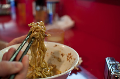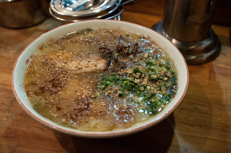 Kumamoto-style ramen differs from its tonkotsu cousin in the north. You still have thick noodles in a heavy pork broth, but Kumamoto drizzles on mayu, a kind of burnt garlic oil, and often offers various garlic condiments as well.