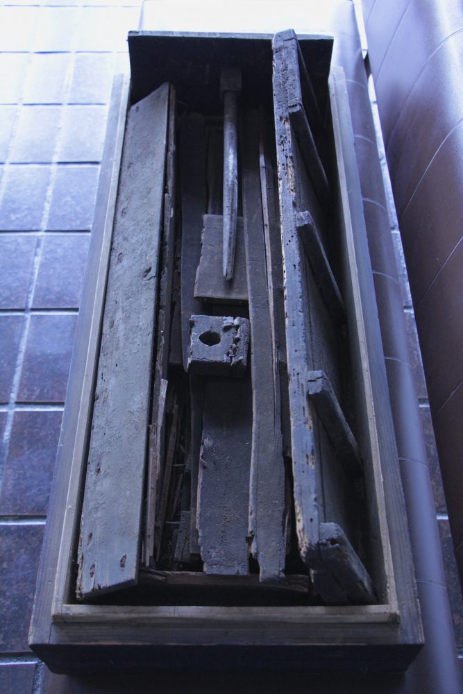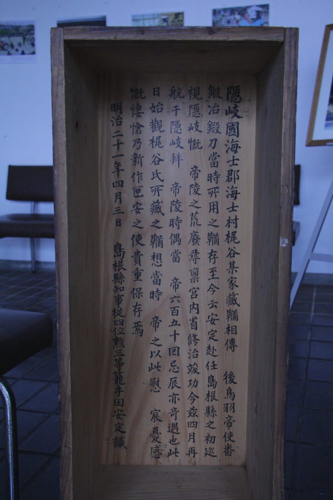 In 1873 Emperor Meiji requested that the remains of Gotoba be reclaimed from Oki Island. It was a symbolic gesture that signified that Gotoba and the court’s long struggle against the Bakufu was over. In 1888, the politician Koteda Yasusada (1840-1899), a former samurai of the Hirado clan and a top kenjutsu student of Yamaoka Tesshu, presented the shrine with a broken down bellows (fuigo) that was said to have been used by Emperor Gotoba during his time on Oki island. The inside of the lid of the presentation box includes an inscription by Yasusada.