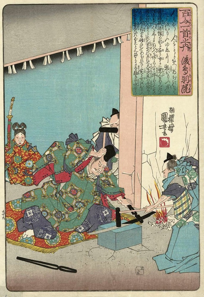 Gotoba and his sword making regained prominence in the late Edo period. There is a print by Utagawa Kuniyoshi (1797-1861) depicting Emperor Gotoba taking part in sword forging. The print could have been produced as part of the imperial restoration movement, looking for men of virtue to serve a revived imperial house.