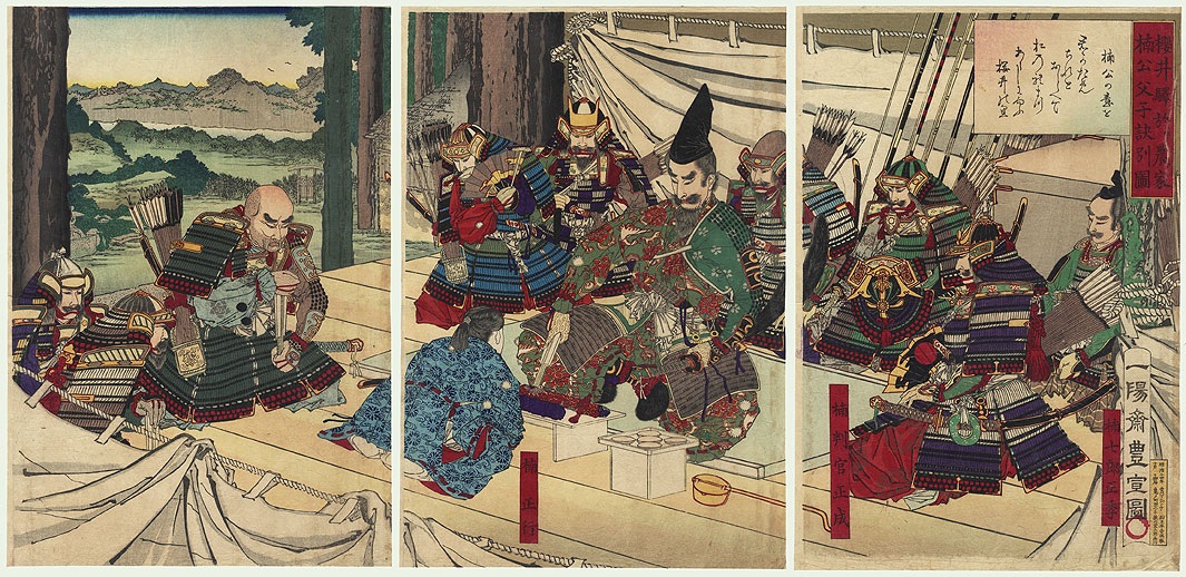 As Masashige wiped his tears, he handed his son the sword that had been made by the Emperor Gotoba and bestowed upon him by the Emperor Godaigo. They then parted in opposite directions. All of the warriors that had witnessed the exchange were moved to tears. (Tadashi Hasegawa, trans., Taiheiki (Tokyo, Shôgakusha, 2008), 153)