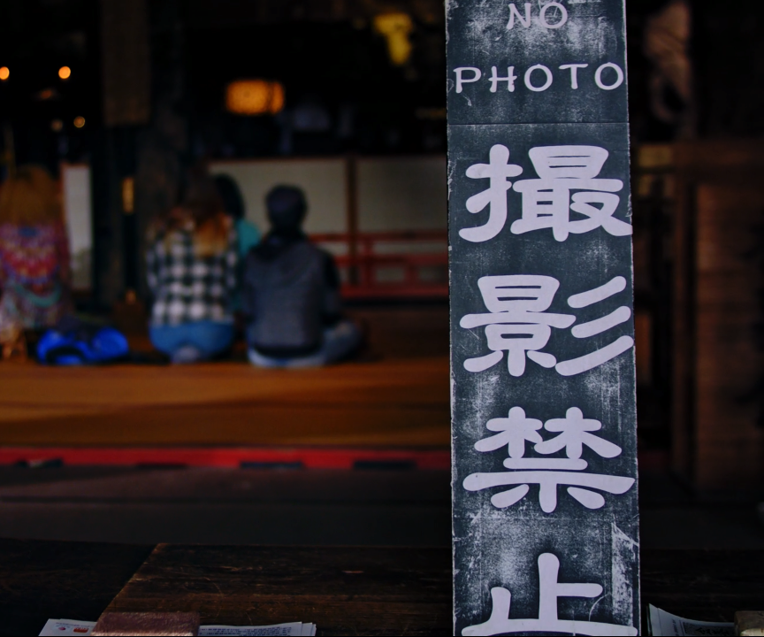 In this video, the first cut is of a foreign woman praying in a temple. But around her, just about every stereotypical rude behavior is displayed. There is a man on the phone. There are loud people chatting. One person is drinking water in a religious dwelling. There is a man with a hat, and people obstructing the walkway with large luggage. Then there are women taking pictures even though it’s forbidden, and a man littering the temple.