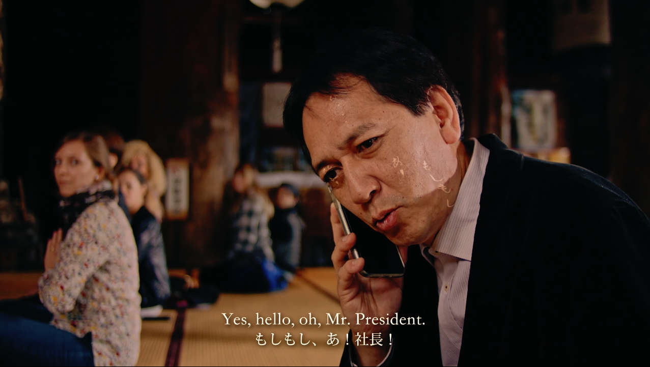 We learn that the man littering knew not to take his drink inside the temple, but didn’t know where to throw it away. So he thought he would leave it on the side of the steps going to the temple. The women taking pictures hadn’t noticed that there was a sign forbidding photography. The other women, chatting loudly, just got a little carried away, and in their thoughts we hear them express their apologies. A French woman expresses frustration because she had hoped for a quiet place, while a Japanese man apologizes to his boss on the phone — he explains that he is in a temple so he can’t take the call.