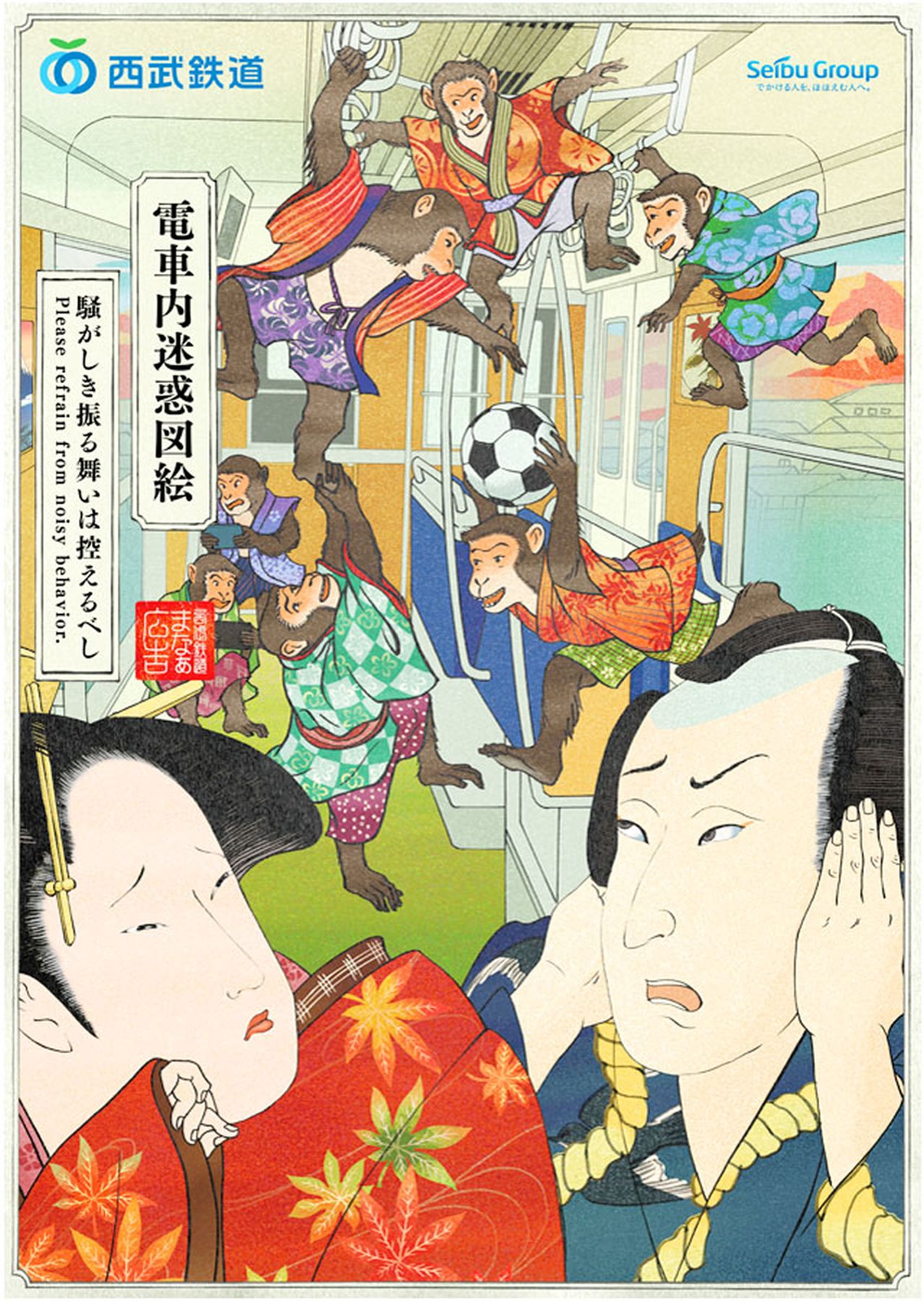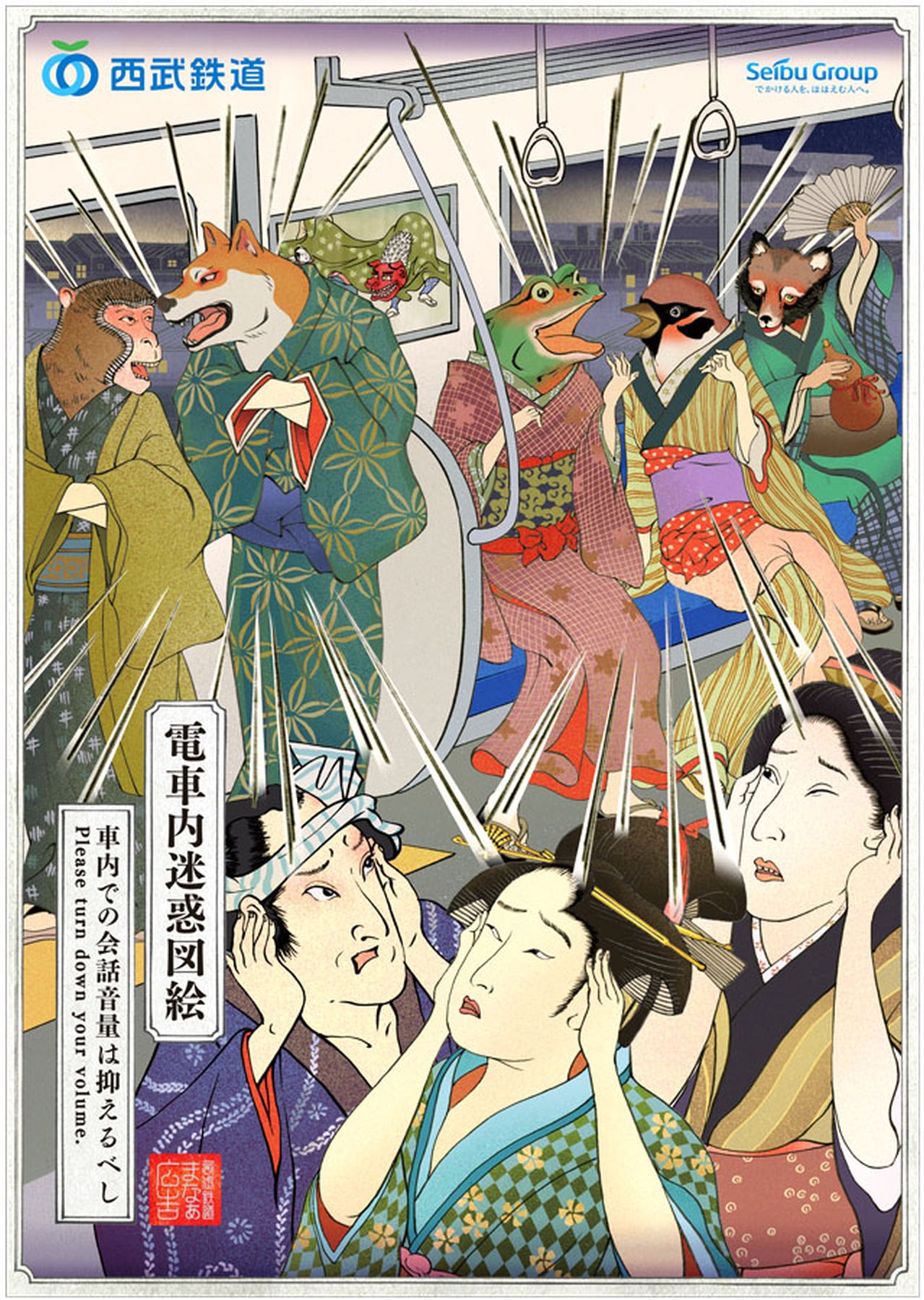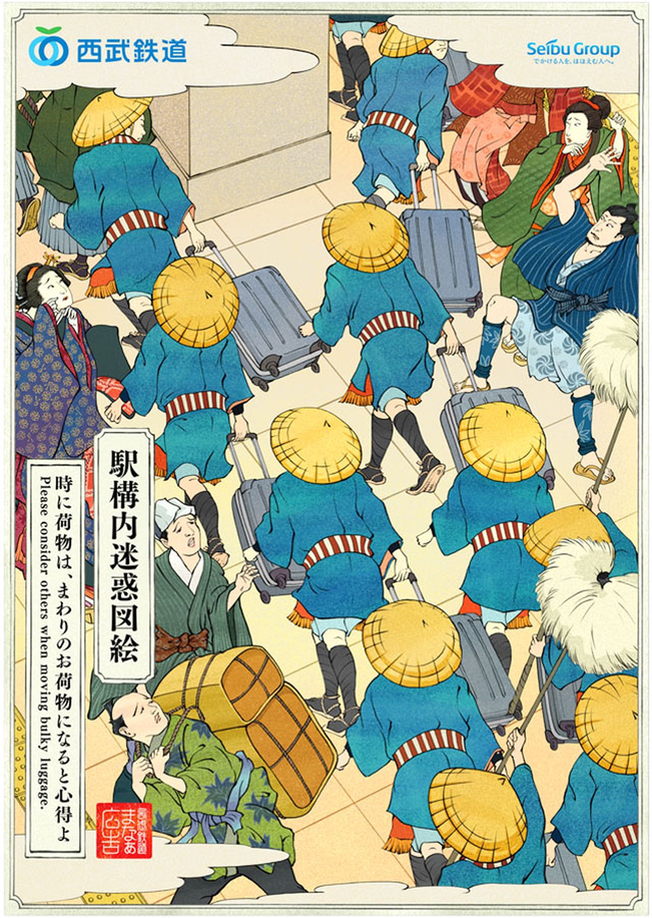 Drawn by illustrator Takahiro Hidowaki, the posters depict ukiyo-e-like manga in modern day situations to entice passengers to be considerate of their fellow train commuters.