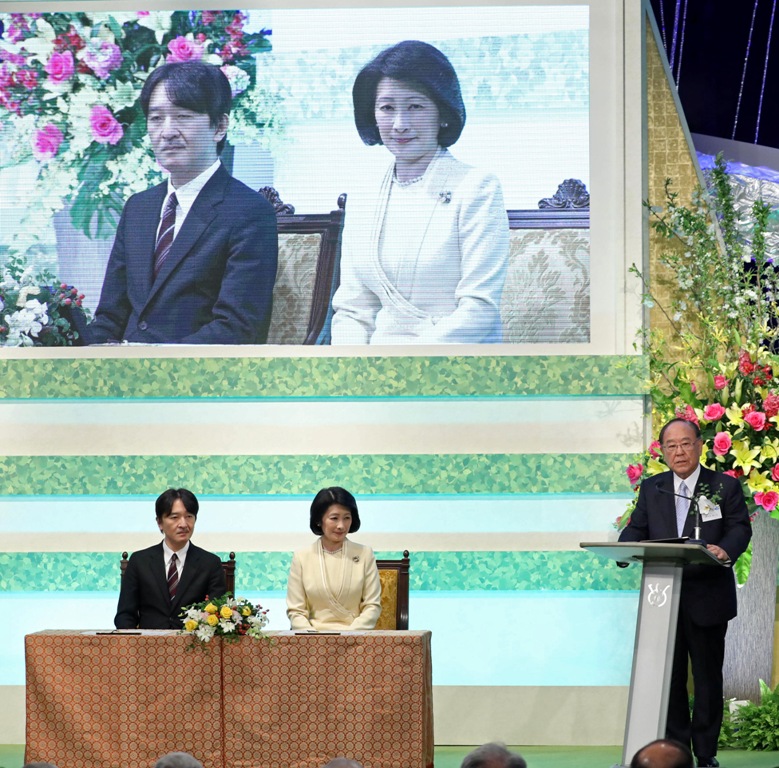 The commendation ceremony of the 27th Annual Grand Prize for the Global Environment Awards, attended by Prince and Princess Akishino (background), was held on April 9 with Fujisankei Communications Group Chairman Hisashi Hieda (right, foreground) awarding the Grand Prize to Sekisui House, Ltd. Chairman Toshinori Abe.
