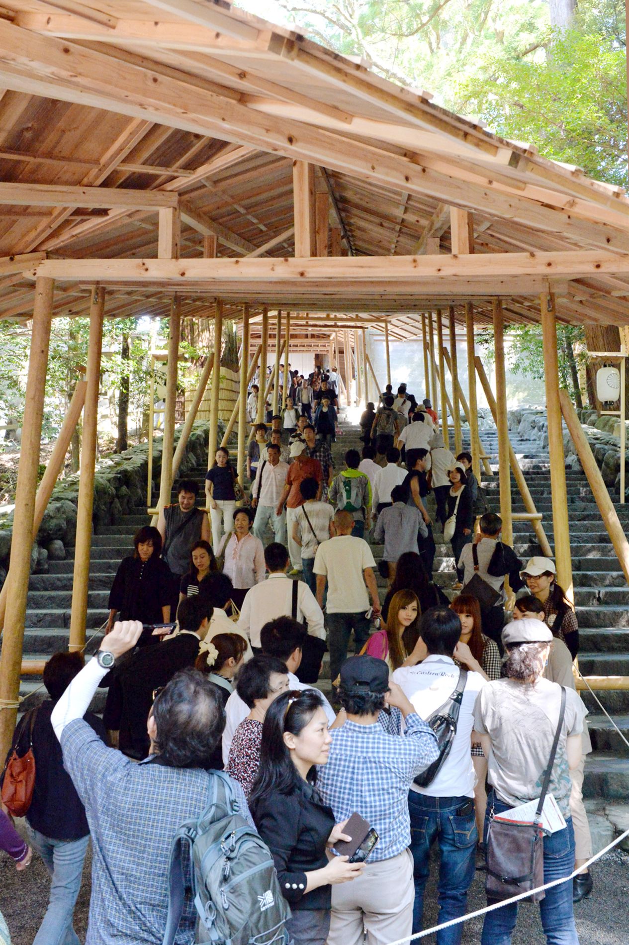 The main pillars that support the roof of the main sanctuary are traditionally reused for the sacred torii gate on Ujibashi Bridge at the entrance of Naiku.