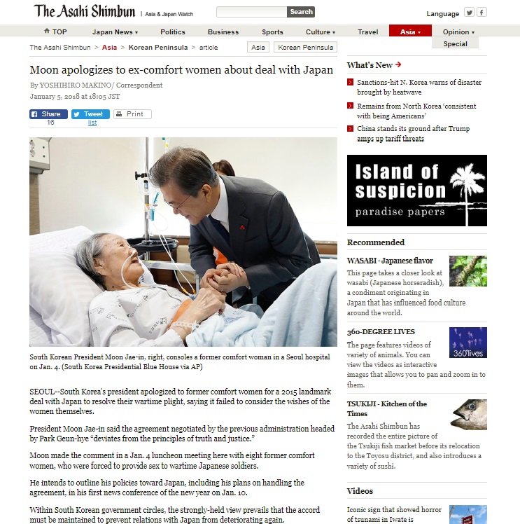 It can safely be said the Kono statement contains a description that “a coercive atmosphere” existed at the military brothels, and the statement has been kept intact by the successive administrations of Japan up to the current Cabinet of Prime Minister Abe. The Asahi Shimbun, when reporting problems involving the comfort women issue, is determined to maintain a multifaceted approach now and in the future, by continuing to listen to diversified viewpoints and opinions while bearing in mind what stand the government takes in dealing with the matter.