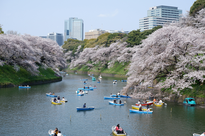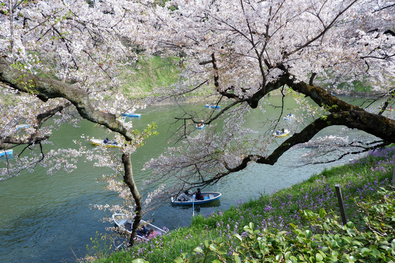 Having been part of Edo Castle, the Kitanomaru Park is surrounded by a moat with numerous cherry trees on its banks. The moat provides a splendid background to the cherry trees as well as offering an opportunity to view the blossoms from pedal or row boats. There was a long queue of people — both Japanese and foreign visitors — hoping to rent one of the boats.