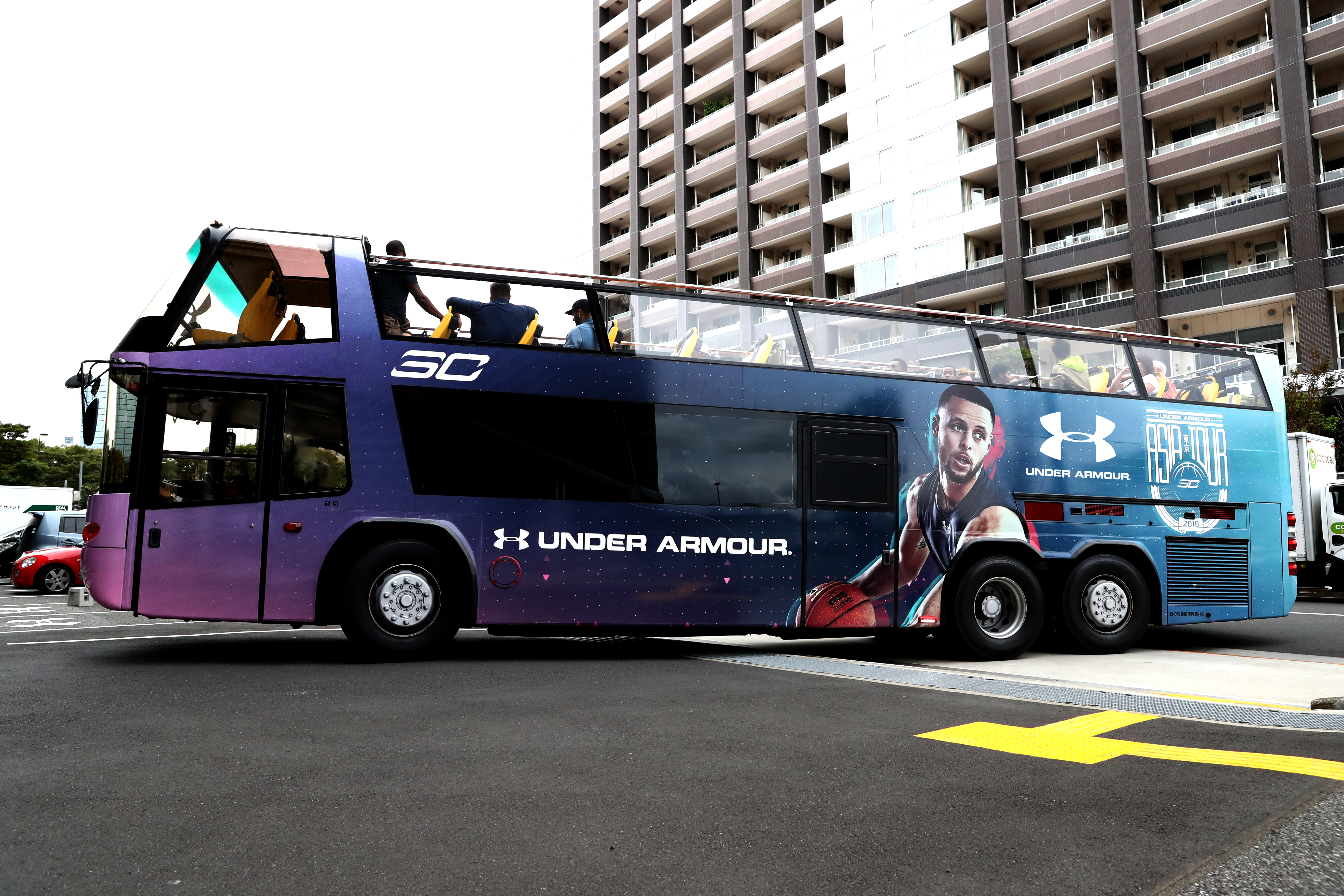 Curry rolled up to the Roppongi Hills Arena in his tour bus, which was customized for this visit. The rooftop was off, giving him a 360 view of the city.