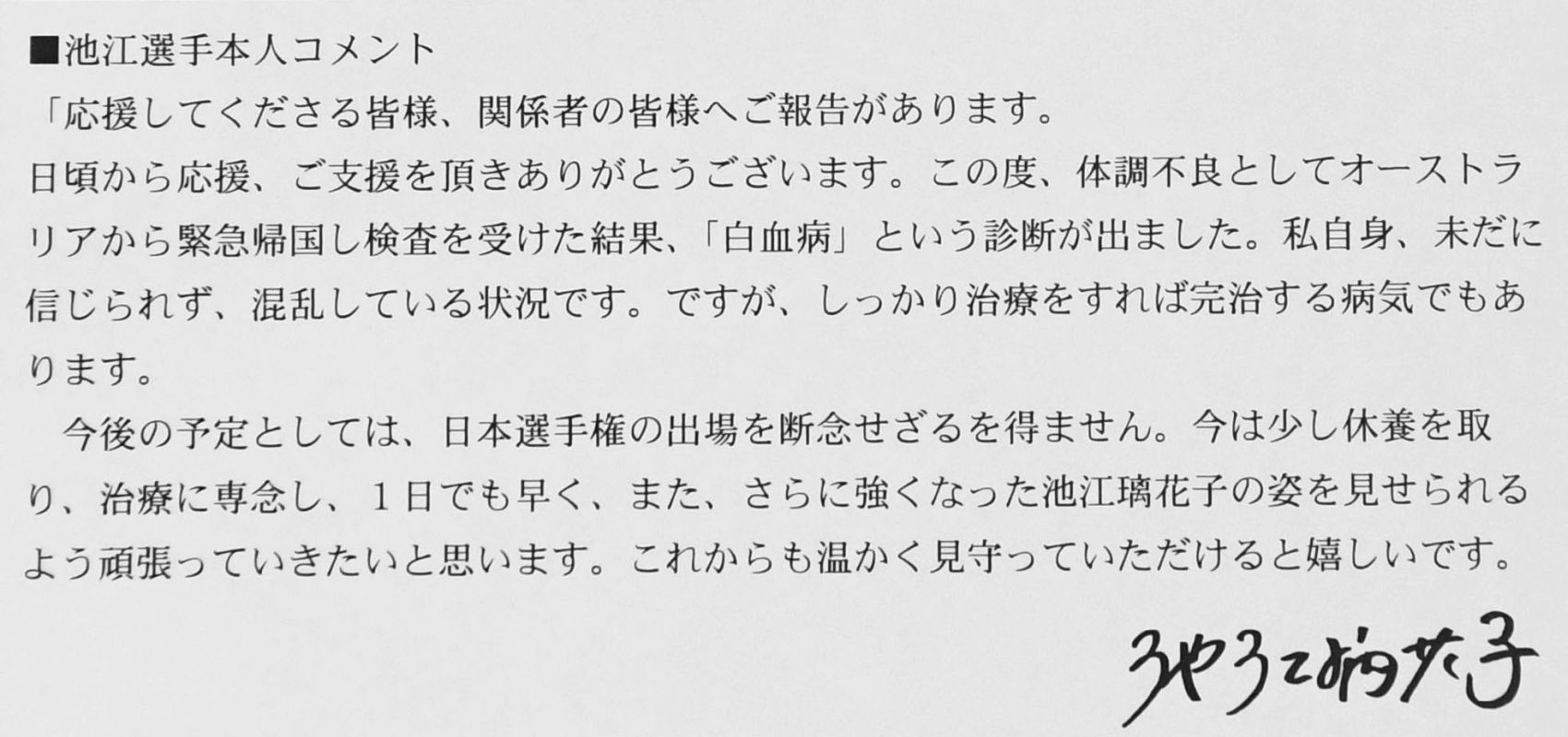 The 18-year old athlete and aspiring Olympian was taken ill in January while in Australia for a training camp. She suddenly returned to Japan to undertake medical tests when she was diagnosed with the illness.