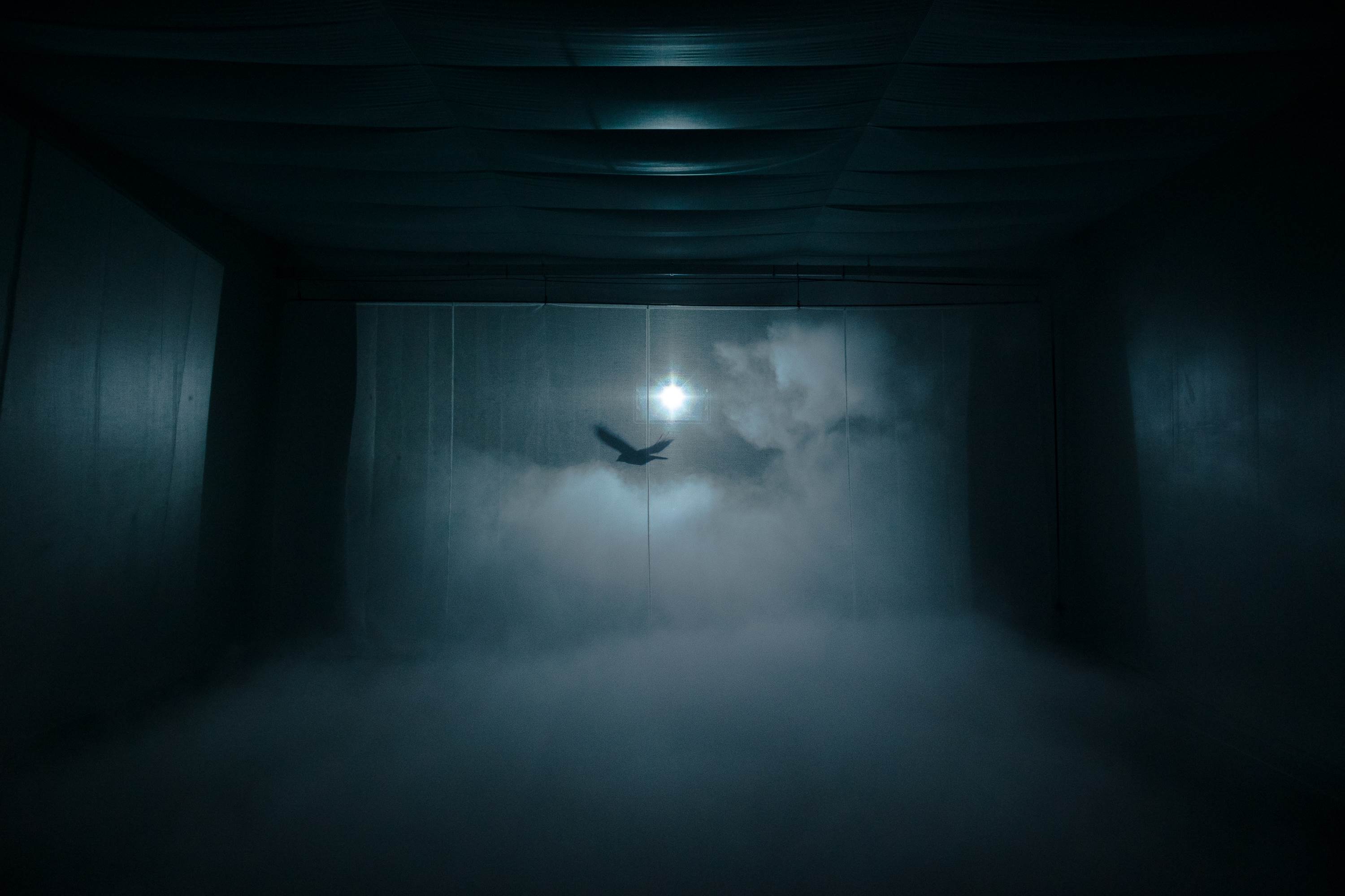 Fugue is another new experimental work which involves projecting images in an exhibition room filled with fog. A crow flies over the sky and the mist seems to suddenly “crumble” away.
