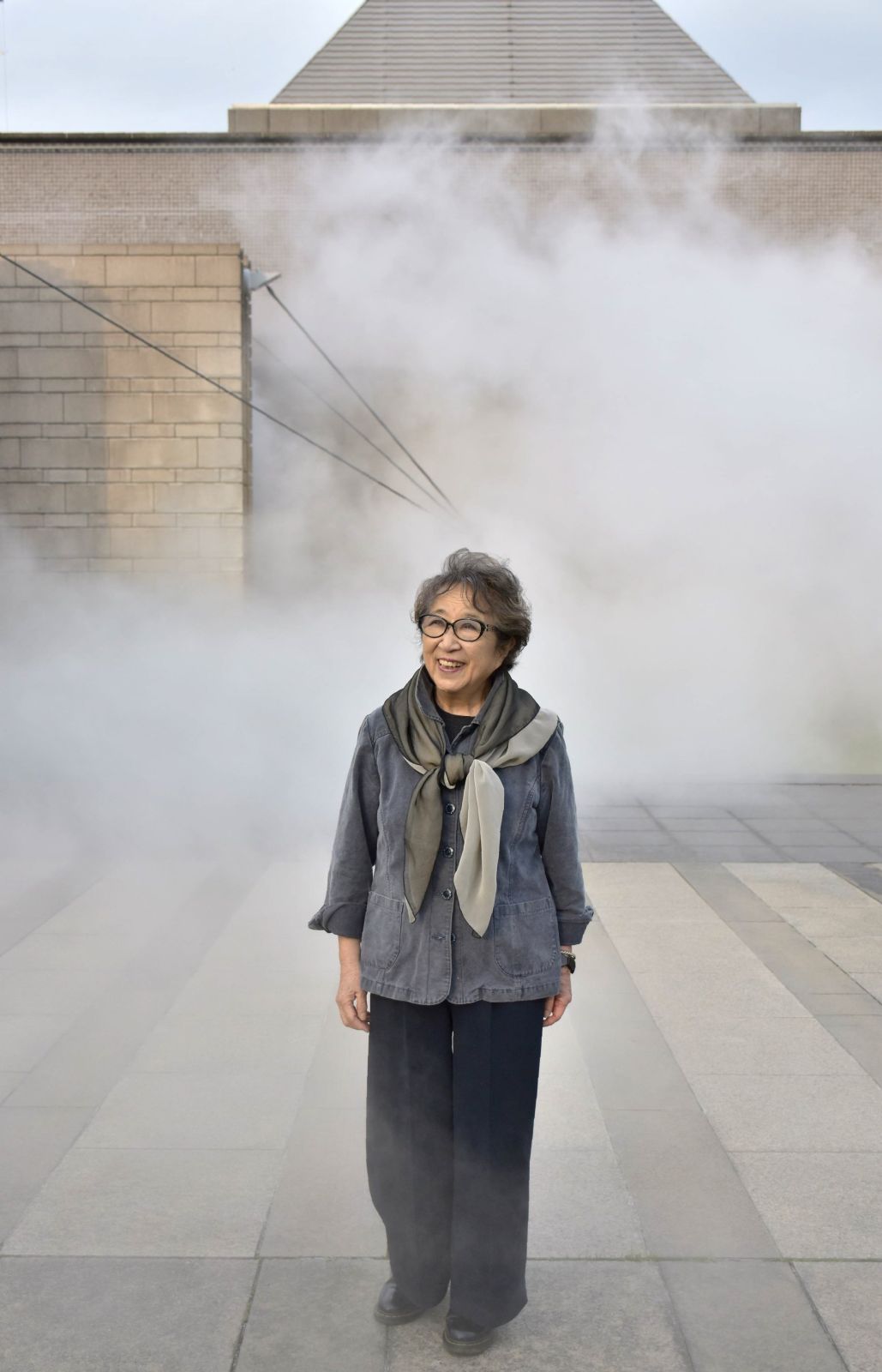 Nakaya ejects an artificial fog over the symbol of the courtyard: a fountain with a gigantic rock suspended in the air. She explains that the aggressive aura of the fountain caught her attention.