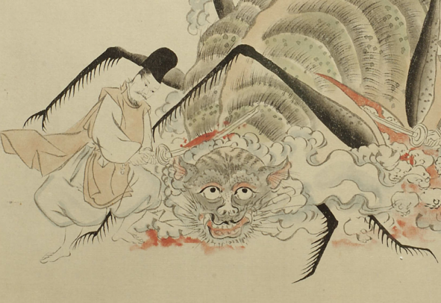 The next day, Yorimitsu and his warriors follow the trail of blood until they come to a large mound at the rear of Kitano shrine. Inside the mound was a giant dirt-spider 120 centimeters in diameter. They pull the spider out, eventually killing it. Yorimitsu’s sword is then renamed the Kumokiri-maru. The actual sword said to be the Kumokiri-maru (Hizamaru) is a cultural property of Aichi prefecture, in the Atsuta Jingu Collection.
