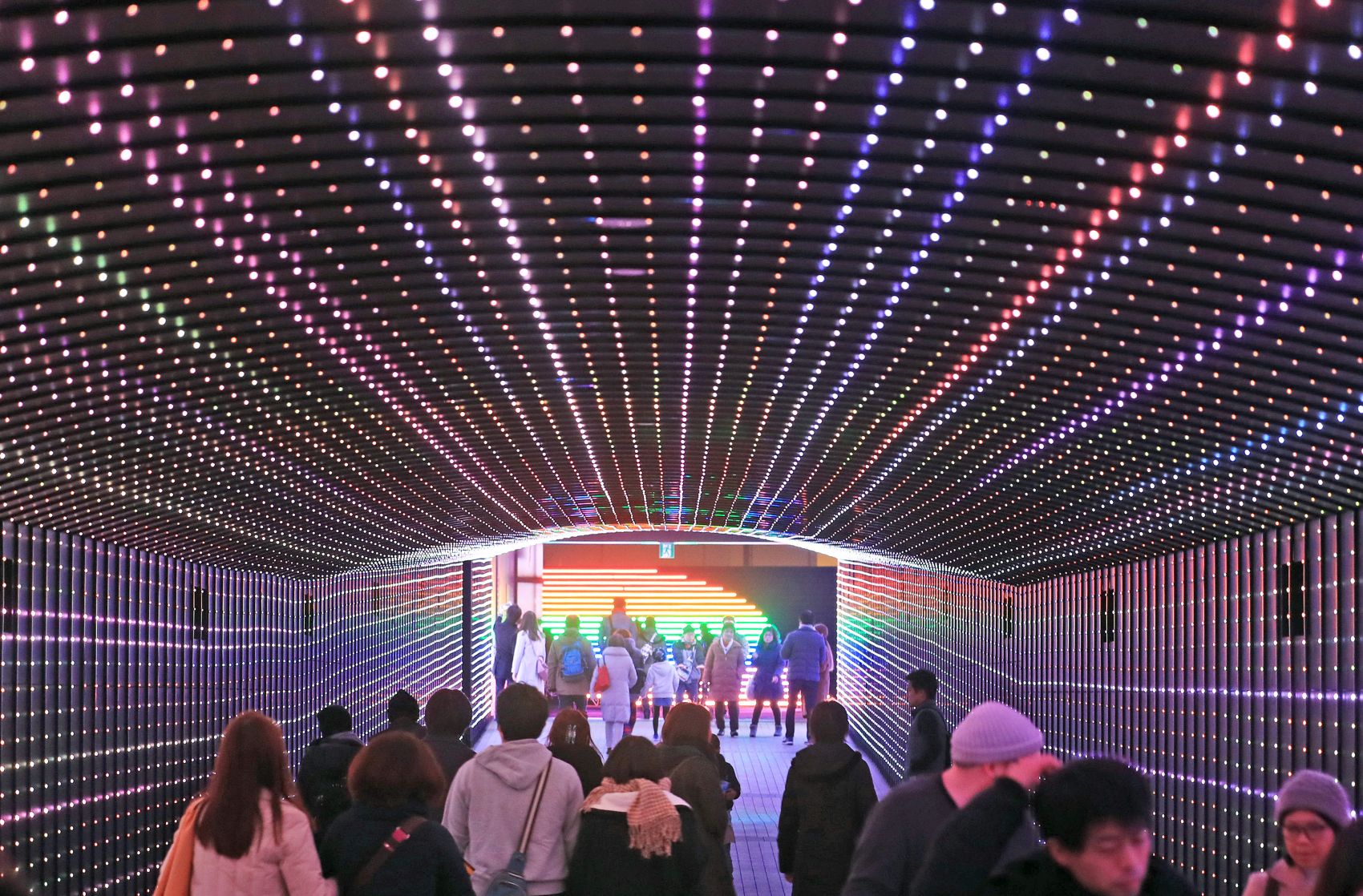 Just after exiting the underground corridor, “Japan’s Original Landscape” spreads before you. This is made up of colorful rice fields and rural scenery, beautifully representing the changing of the seasons. Onlookers happily snap away at the lights depicting the lovely landscape.