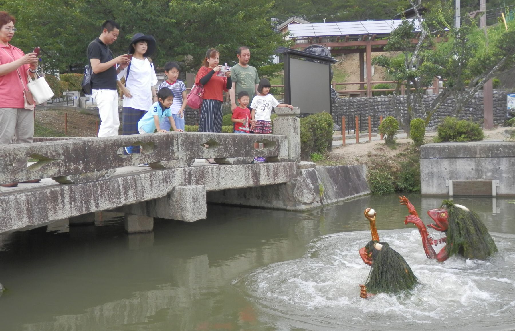 In a corner of the town’s Tsujikawayama Park, a 30-minute walk from JR Fukusaki Station, a crowd of tourists surrounds a murky pond, staring at its surface. Eventually, small bubbles begin to surface and two red kappa (amphibious yokai) appear — one big and one small.