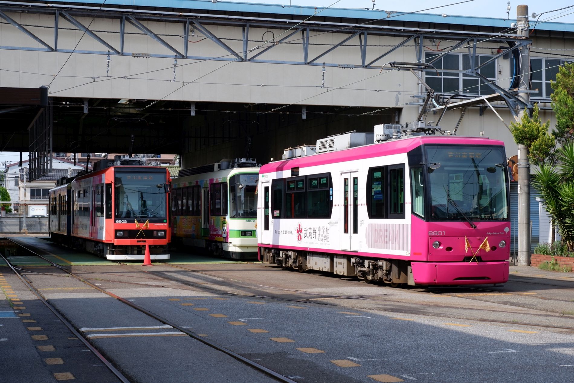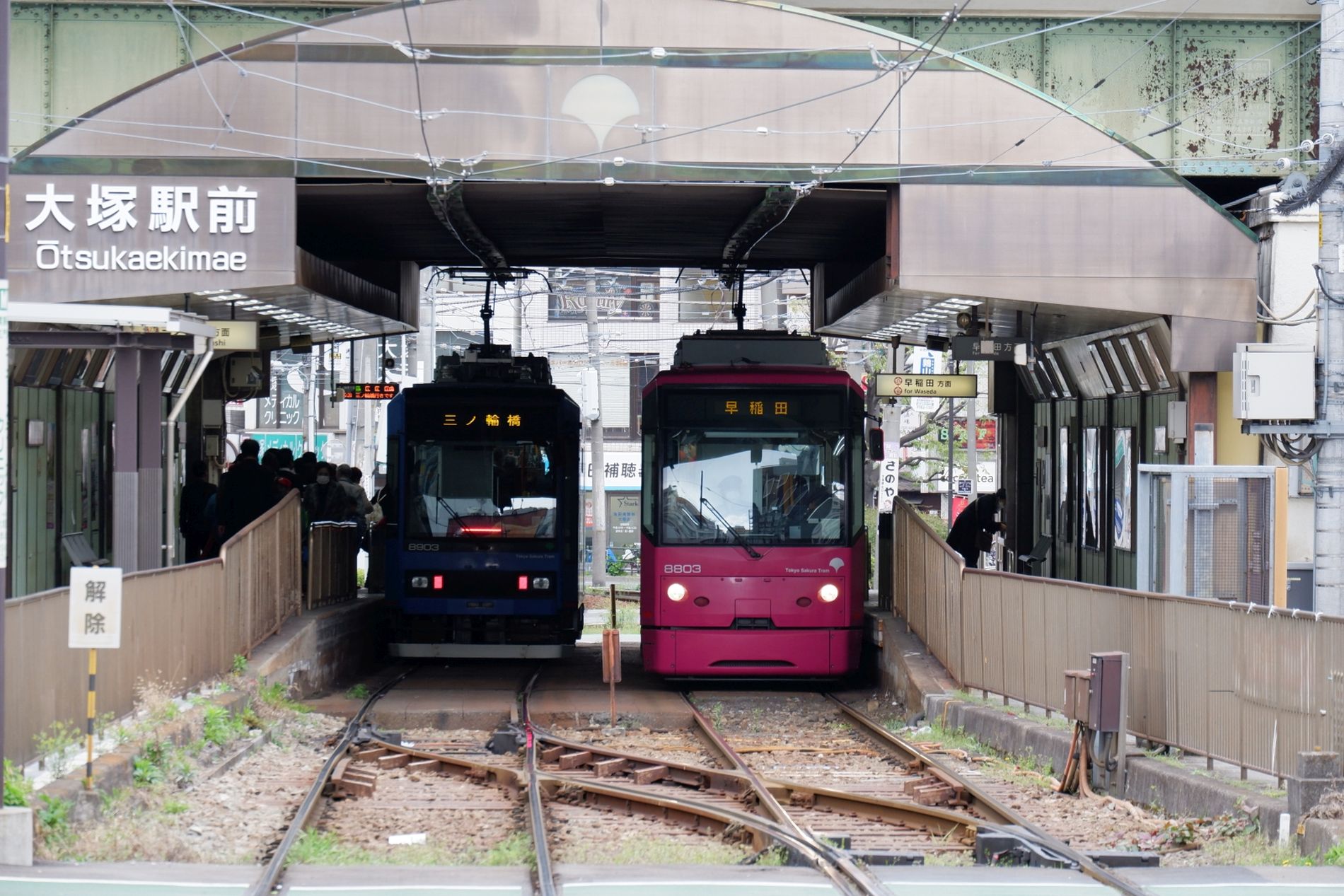 They were preserved because much of their routes were on a dedicated right of way closed to automobiles. As such, the terminal points of the Arakawa Line are neither particularly notable nor are they transfer points to other lines. The eastern terminus at Minowabashi is the entrance to a decaying shopping street. The western terminus at Waseda is in the middle of a busy street where the dedicated right of way ended.