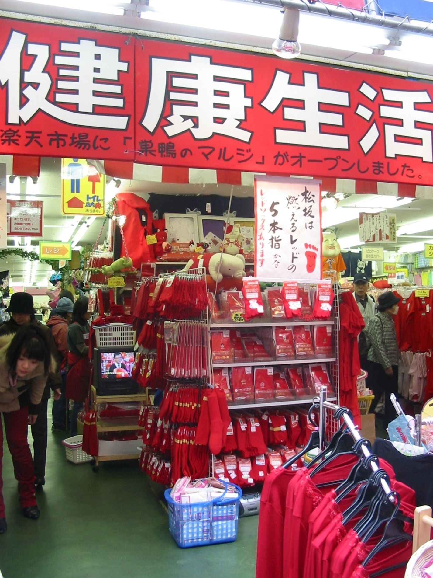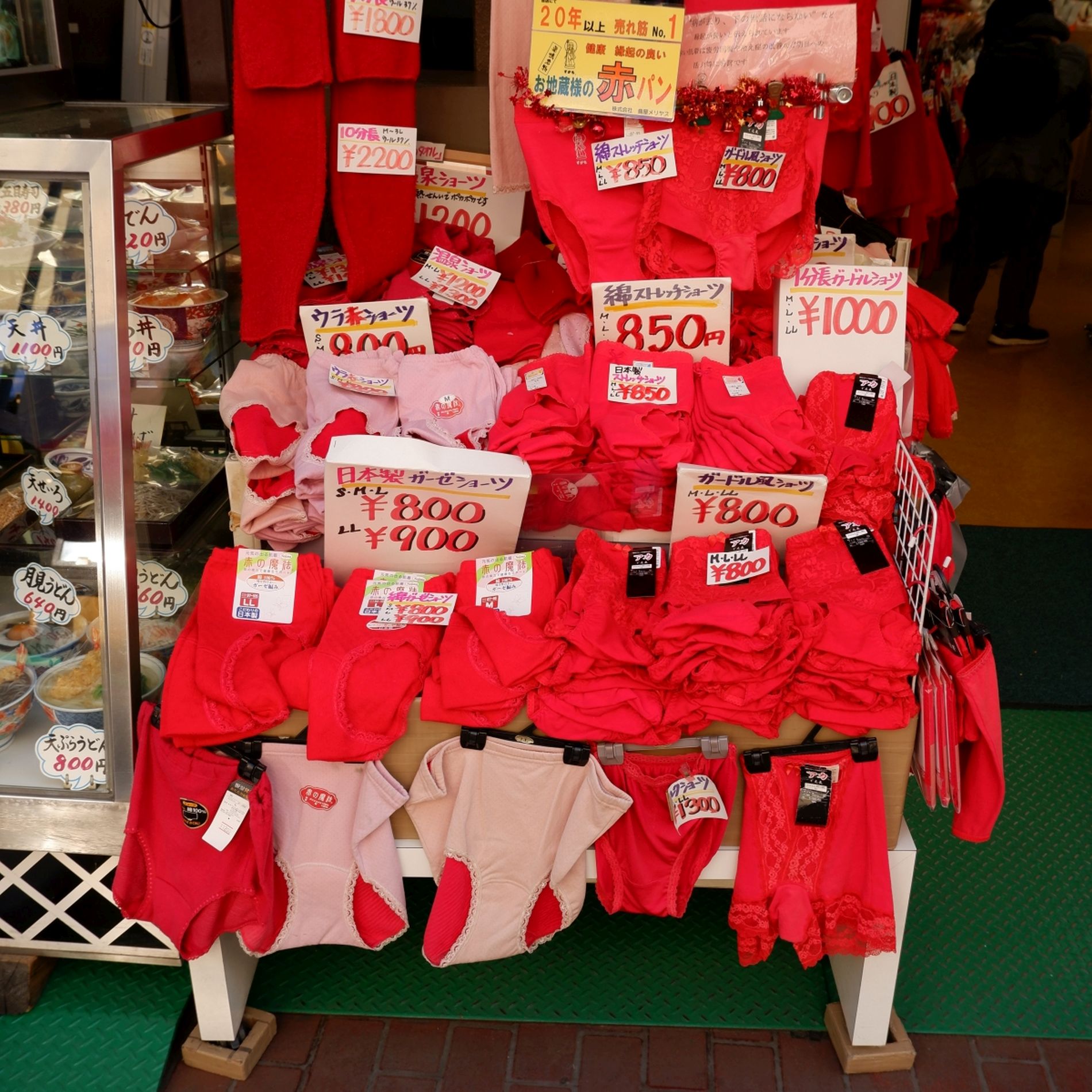 A short ride from Asukayama Park to the west is the Koshin Zuka stop at the north end of the Jizo Dori shopping street. The street is often styled the Harajuku for Grannies (Fashion Street for Grannies) because of the many shops selling apparel popular with older women including red knickers that are associated with good health and longevity.