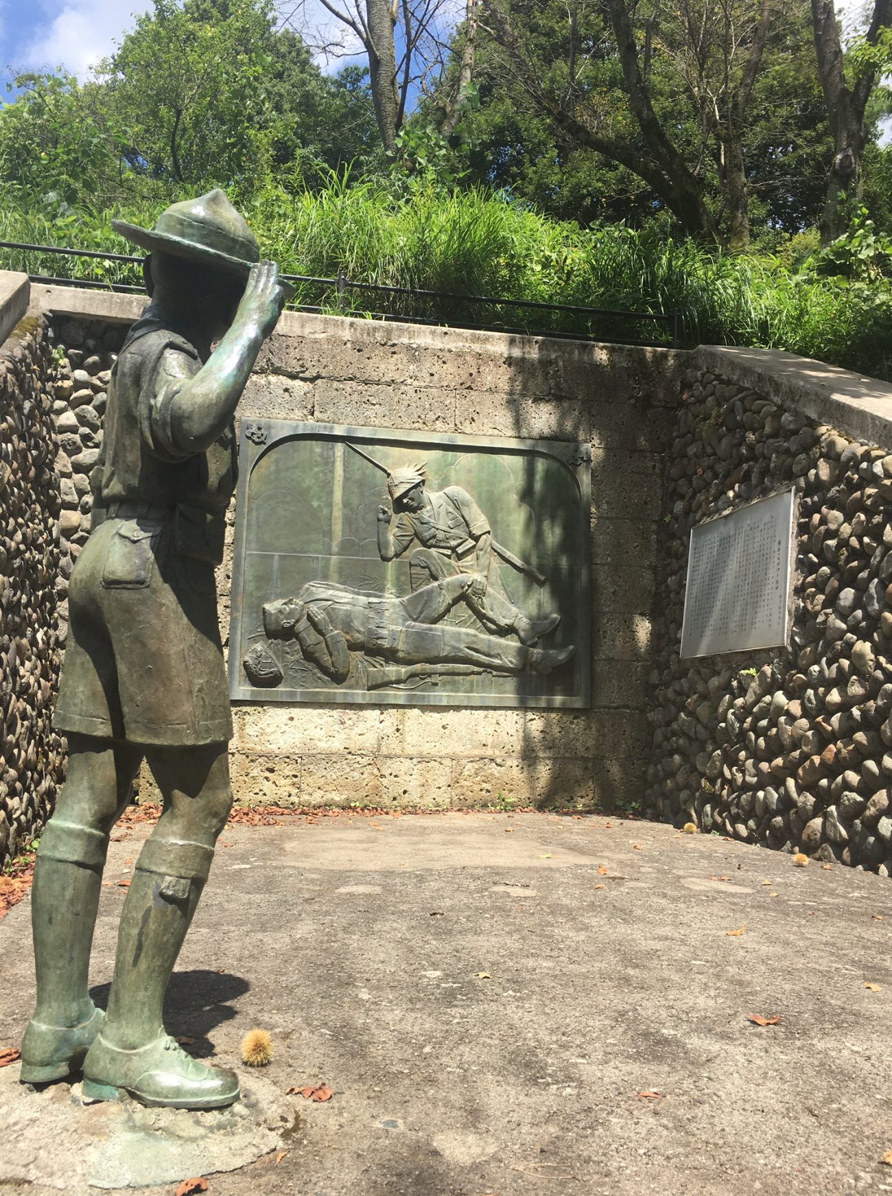 After going up several steps, the visitor will first pass a statue of a young boy in uniform presenting a three-finger Scout salute before the memorial. Directly ahead is a beautiful bas-relief (1.7 meters tall and 2.2 meters wide) designed by the famous sculptor Yokoe Yoshizumi and cast by Yamauchi Shunzō in the late 1950s. To its right is a plaque with text in Japanese only (which is unfortunate for non-Japanese readers who may visit there or otherwise be curious).