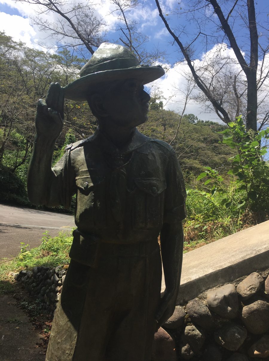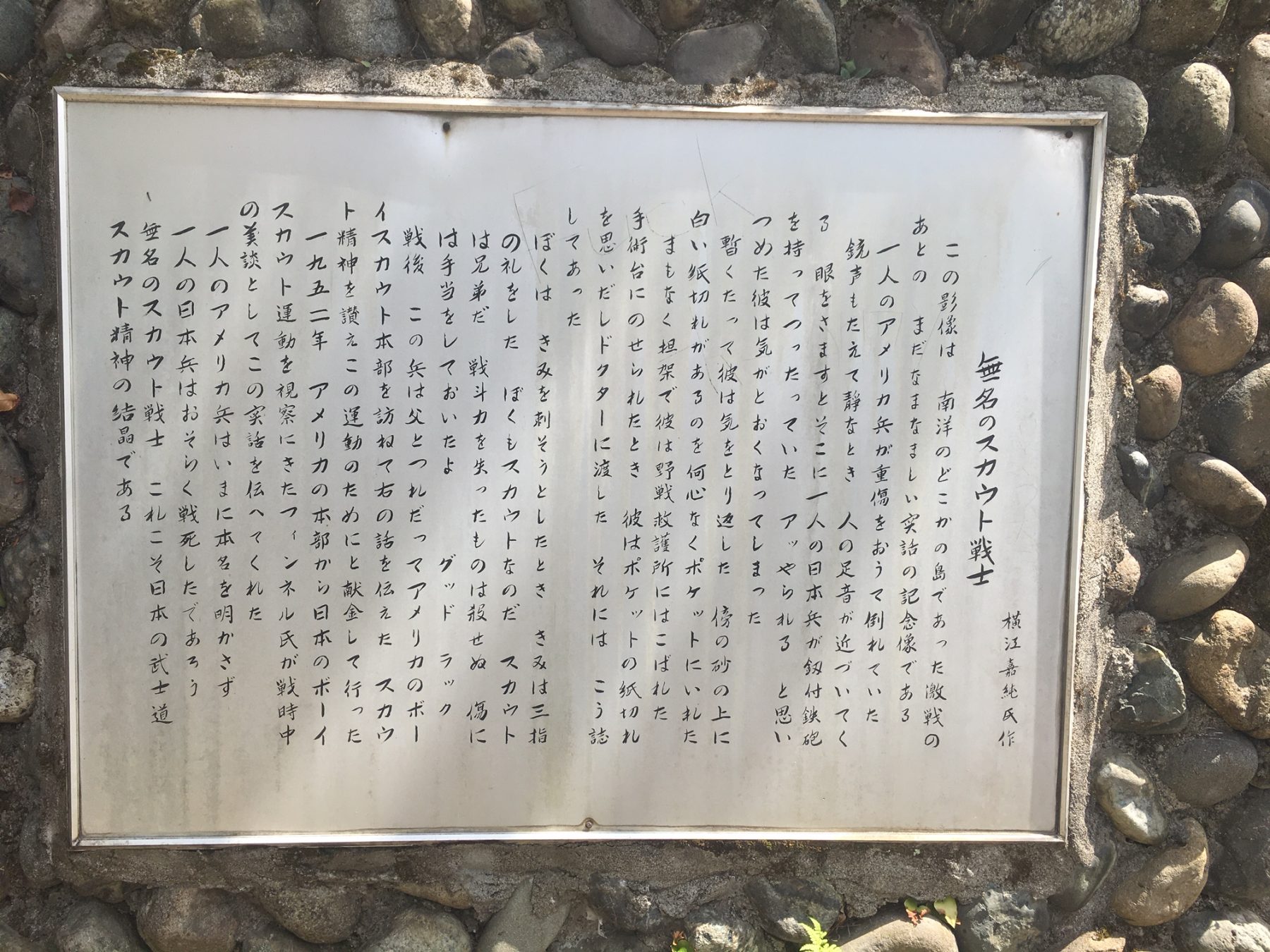 This is a story from a south Pacific island during World War II. A wounded American soldier had fallen. A Japanese soldier with a bayonet happened by. When the American saw him, he thought he would be killed and passed out. He woke up later. The Japanese soldier was nowhere to be seen. He saw a piece of paper and put it away in his pocket. He was taken to a field hospital where his life was saved. The note he had picked up had this written on it. “As I was about to stab you, you saluted me with three fingers. I also was a Boy Scout. Boy Scouts are brothers. You are my brother. It is forbidden to kill anyway who no longer can fight. I applied a bandage to your wound. Good luck.” After the war, the U.S. soldier visited the Boy Scout Association and told them the story. When officials from the BSA visited Japan in 1952, they informed their hosts of the story. The American soldier did not give his name. The Japanese soldier appears to have died in the war. This is a memorial to what happened between these two anonymous Scout soldiers. The actions of this Japanese soldier are the crystallization of Japanese Bushido and the Scout spirit.